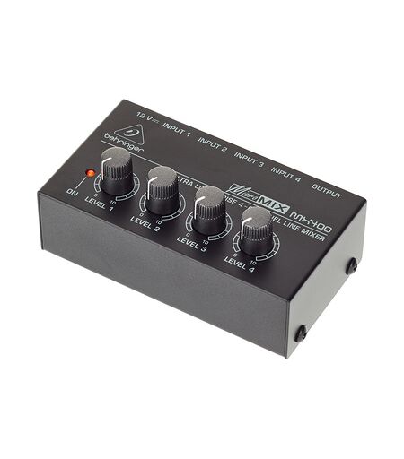 BEHRINGER MICROMIX MX400, 4-Kanal Line-Mixer, Separate Lautstärkeregelung für jeden Kanal, 12-Volt Netzteil im Lieferumfang enthalten, Anschlüsse: 4x 6,3mm Monoklinke Input, 1x 6,3mm Monoklinke Output, Abmessungen Dimensions 46,5 x 57,2 x 103,6 mm, Gewicht 190 g ...