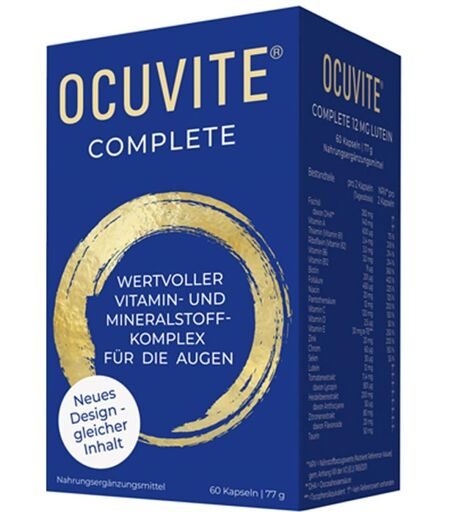 Anwendungsgebiet von Ocuvite Complete 12 mg Lutein KapselnDurch den natürlichen Alterungsprozess und die gegebenen Anforderungen der heutigen Zeit kommt es bei unseren Augen zu einer übermäßigen Beanspruchung beim Sehen. Deshalb braucht unser Organismus stets und ständig eine ausreichende Versorgung mit Vitaminen und Nährstoffen. Ocuvite Complete 12 mg Lutein Kapseln ist ein Nahrungsergänzungsmittel mit Vitaminen und wertvollen Mineralstoffen. Es enthält Riboflavin (Vitamin B2), Zink und Vitamin A, die zum Erhalt der normalen Sehkraft beitragen. Wirkungsweise von Ocuvite Complete 12 mg Lutein KapselnOcuvite Complete 12 mg Lutein Kapseln enthalten die Vitamine A und B2 (Riboflavin) zum Erhalt der Sehkraft sowie wertvolles Lutein, Omega-3-Fettsäuren und das wichtige Spurenelement Zink, das dazu beiträgt, die Zellen vor oxidativem Stress zu schützen.Wirkstoffe / Inhaltsstoffe / ZutatenZutaten von Ocuvite Complete 12 mg Lutein Kapseln: Gelatine Sojaöl Fischöl (11 %) Feuchthaltemittel: Glycerin Heidelbeerextrakt (7,8 %) Lutein (0,5 %) Calcium-L ascorbat (Vitamin C) Zinkgluconat Zitronenextrakt (3,1 %) DL-alpha-Tocopherolacetat (Vitamin E) Taurin (1,9 %) gehärtetes Sojaöl Trennmittel: Calciumphosphat Nicotinamid Calcium-D-pantothenat Verdickungsmittel: Siliciumdioxid Emulgator: Sojalecithin Cyanocobalamin (Vitamin B12) Tomatenextrakt (0,4 %) Farbstoffe: Eisenoxide und Eisenhydroxide Pyridoxinhydrochlorid (Vitamin B6) Thiaminnitrat (Vitamin B1) Riboflavin (Vitamin B2) Retinylpalmitat (Vitamin A) Folsäure Chrom(III)chlorid Biotin Cholecalciferol (Vitamin D3) Natriumselenit. Kann Spuren von Nüssen enthalten. Inhaltsstoffe pro 2 Kapseln (Tagesdosis) NRV*pro 2 Kapseln ( in %) Fischöl, (davon Docosahexaensäure) 282 mg (140 mg) */* Vitamin A 600 μg 75 % Thiamin (Vitamin B1) 2,4 mg 218 % Riboflavin (Vitamin B2) 3,0 mg 214 % ...