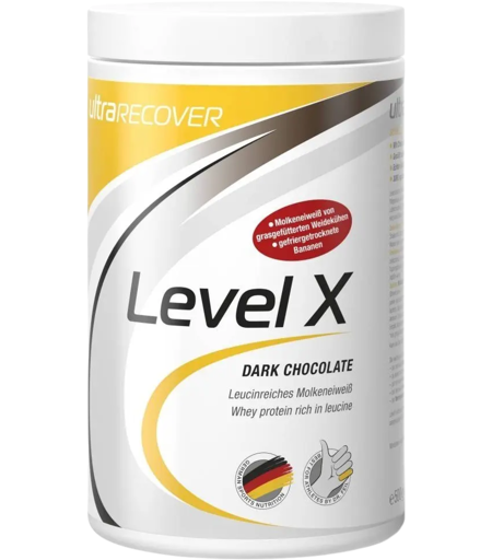UltraRECOVER Level X Dark Chocolate - Leucinreiches Molkeneiweißkonzentrat mit Vitaminen, Zink, Magnesium und Selen. Eine Optimierung im Herstellungsprozess bringt ein besseres Auflösungsverhalten – NEU: besser löslich! Produktneuerungen Neu: Echter Geschmack durch gefriergetrocknete Früchte Neu: Hochwertiges Molkeneiweiß von grasgefütterten Weidekühen (laktosearm) Gesüßt mit Birkenzucker und Stevia / Frei von sonstigen Süßstoffen Die wertvollen Inhaltsstoffe von Level X liefern einen Beitrag zu einem normalen Fettstoffwechsel (Cholin), zur normalen Immunfunktion (Selen, Zink und Vitamin B6), zur normalen Muskelfunktion (Vitamin D3), zur Verringerung von Ermüdung und Erschöpfung (Magnesium; Vitamin B6), zurnormalen Proteinbildung (Zink), zur Erhaltung der Muskulatur /zum Muskelaufbau (Protein). Zutaten: Molkenproteinkonzentrat* (52 %, laktosearm), Süßungsmittel (Birkenzucker 14 %, Steviolglykoside 0,1 %), Kakaopulver (13 %), Bananenpulver (gefriergetrocknet, 11 %), Emulgatoren (Sonnenblumenlezithin, Sojalezithin), Magnesiumcitrat, L-Leucin, Zinkcitrat, Ingwerextrakt, natürliche Aromen, Cholinbitartrat, Rhodiola-Rosea-Extrakt (0,44 %), Zimt, Bourbon-Vanille-Extrakt, Maltodextrin, Vitamin B6, Vitamin D3, Natriumselenat. *von grasgefütterten Weidekühen Anwendung: 45 g Pulver (3 leicht gehäufte Esslöffel) in 200 ml Wasser / Milch einrühren. Besonderheiten: glutenfrei und laktosefrei, wenn mit Wasser oder laktosefreier Milch zubereitet Inhalt: 1 Dose Level X Dark Chocolate enthält 550 g = 2,2 l, das entspricht 11 Portionen à 50 g Geschmacksrichtung: Dark Chocolate ...