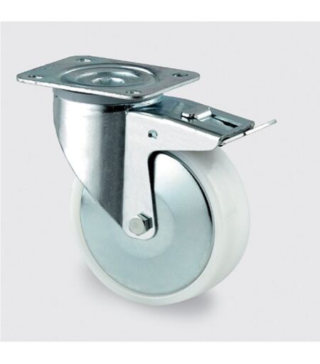 Polyamidräder mit einer Tragfähigkeit von 200 - 350 kg Eigenschaften: Raddurchmesser (mm): 125, Radbreite (mm): 40, Radbauhöhe (mm): 155, Tragfähigkeit (kg): 275, Plattenmaße (mm): 105 x 85, Lochabstand A (mm): 80, Lochabstand B (mm): 60, Bohrungsdurchmesser (mm): 9, Halterungstyp: durch die Platte, Radtyp: drehbar mit Bremse, Lagertyp: Rollenlager ...