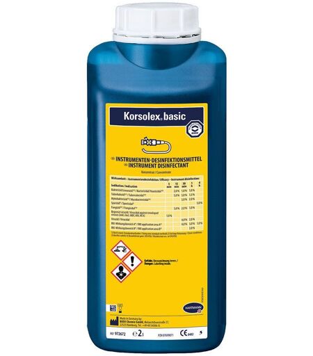 Korsolex® basic Aldehydisches Desinfektionsmittel für thermolabile und -stabile Instrumente mit viruzider Wirksamkeit. viruzid sporizid RKI-gelistet hohe Materialverträglichkeit Erforderliches Wirkungsspektrum SARS-CoV-2: begrenzt viruzid Alle Desinfektionsmittel von HARTMANN für Hände, Haut, Flächen und Instrumente erfüllen die Wirksamkeitsanforderungen an die begrenzte Viruzidie und können verwendet werden. Anwendung Korsolex basic eignet sich zur Aufbereitung von thermolabilem und thermostabilem Instrumentarium (inkl. flexible Endoskope) im manuellen Tauchbadverfahren sowie für Zirkulationsverfahren im Kaltverfahren. ...