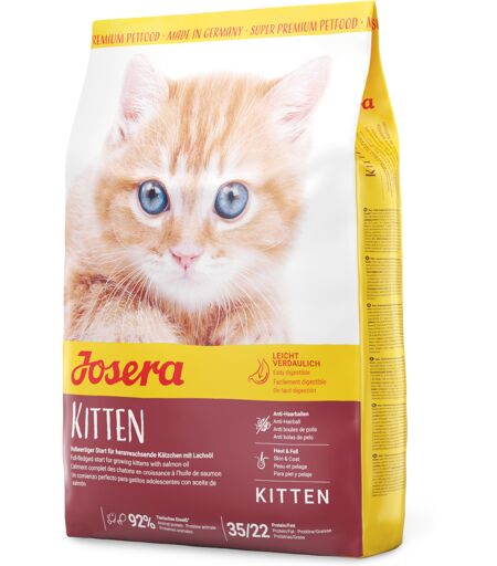 Katzen sind neugierig, wollen die Welt erkunden und das von Kindespfoten an. Josera Kitten versorgt kleine Kätzchen bis zum 12. Monat mit allem, was sie benötigen. Ein ausgeglichener Fettgehalt in Verbindung mit viel tierischem Protein aus Geflügel kann das optimale Wachstum deines kleinen Stubentigers begünstigen. Für eine unbeschwerliche Fellpflege sorgen Omega-3- und -6-Fettsäuren, die eine normale Haut und ein glänzendes Fell unterstützen können. Hinzu kommen diätetische Fasern, die die Bildung von Haarballen mindern und damit die Verdauung fördern können. Josera Kitten ist auch für tragende und säugende Katzen geeignet und komplettiert damit den Rundumschutz des heranwachsenden Stubentigers. Josera Kitten im Überblick: Hochwertiges Trockenfutter für Kätzchen bis zum 12. Monat und für tragende, säugende Katzen Leckeres Geflügel: leicht verdaulich und an die Verdauung des Kittens angepasst Viel Energie und Proteine: kann optimales Wachstum unterstützen, 92% tierisches Eiweiß Lachsöl: enthält Omega-3- und -6-Fettsäuren, die Fell und Haut unterstützen können Diätetische Fasern: können Haarballenbildung mindern Vitamine Mineralstoffe: liefern deinem Kitten alles, was es benötigt Glutenfrei: zur Schonung des Verdauungsapparats Aromasicher: dank wiederverschließbarem Zip-Verschluss Hochwertige Zutaten: ohne Gentechnik Made in Germany: 100% klimaneutrale tierversuchsfreie Produktion Frei von Weizen, Zucker, Soja Milchprodukten ...