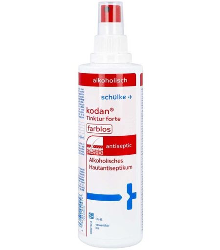 Anwendungsgebiet von Kodan Tinktur forte farblosKodan Tinktur forte farblos ist ein gebrauchsfertiges und ausgezeichnet hautverträgliches Hautantiseptum (Desinfektionsmittel). Kodan Tinktur forte farblos eignet sich zur bequemen hygienischen Händedesinfektion, zur Wund- und Nahtversorgung, zur Hautdesinfektion vor Injektionen, Punktionen, Exzisionen und Gelenkpunktionen und zur präoperativer Hautdesinfektion. Zur präoperativen Hautantiseptik / postoperativen Nahtversorgung Vor Katheterisierungen, Injektionen, Blutentnahmen, Punktionen, Exzisionen, Kanülierungen und Biopsien Zur Unterstützung allgemein-hygienischer Maßnahmen im Rahmen der Vorbeugung von Hautpilzerkrankungen Zur hygienischen Händedesinfektion* * die VAH Listung umfasst nicht die hygienische HändedesinfektionWirkungsweise von Kodan Tinktur forte farblosKodan Tinktur forte farblos wirkt in seiner Zusammensetzung gegen Bakterien, Viren (lipophil) und Pilze. Die Wundheilung wird durch Kodan Tinktur forte farblos in keinster Weise beeinträchtigt, sondern ausschließlich gefördert. Wirksamkeit Konzentration Einwirkzeit MRSA gebrauchsfertig 15 Sek. begrenzt viruzid gemäß DVV gebrauchsfertig 15 Sek. HSV gemäß DVV gebrauchsfertig 15 Sek. Adenovirus gemäß DVV gebrauchsfertig 10 Min. Rotavirus gemäß DVV gebrauchsfertig 30 Sek.Wirkstoffe / Inhaltsstoffe / ZutatenWirkstoffe von Kodan Tinktur forte farblos: 100 g Lösung enthalten: 2-Propanol (Ph.Eur.) 45,0 g, 1-Propanol (Ph.Eur.)10,0 g, Biphenyl-2-ol 0,20 g. Sonstige Bestandteile: Wasserstoffperoxid-Lösung 30 % (Ph.Eur), gereinigtes Wasser.GegenanzeigenBei Überempfindlichkeit gegenüber einen der oben genannten Inhaltsstoffe sollte das Produkt nicht angewendet werden. Nicht zur chirurgischen Händedesinfektion verwenden.DosierungAnwendungsempfehlung von Kodan Tinktur forte farblos: Kodan Tinktur forte farblos wird unverdünnt aufgetragen. Zur hygienische ...
