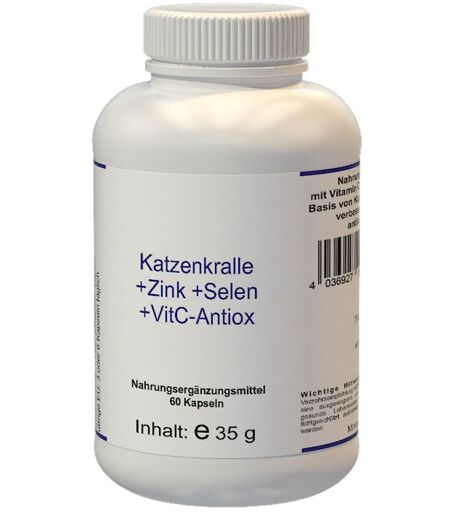 Nahrungsergänzungsmittel sind kein Ersatz für eine ausgewogene und abwechslungsreiche Ernährung und eine gesunde Lebensweise. Nahrungsergänzungsmittel mit Vitamin C, Zink und Selen in einer Basis von Katzenkrallenwurzel für eine verbesserte Versorgung mit antioxidativen Stoffen.Zutaten: Katzenkrallenwurzelextrakt, Ascorbinsäure (Vit. C), Gelatine (mit Farbstoff ), Zink als Zinkcitrat, Selen als Natriumselenat. Nährwerte 1 K./RDA (%) 3 K./RDA (%) 6 K./RDA (%) Katzenkrallenext. 250 mg/- 750 mg/- 1500 mg/- Vitamin C 200 mg/290 600 mg/870 1200 mg/1740 Zink 5 mg/50 15 mg/150 30 mg/300 Selen 50 µg/91 150 µg/273 300 µg/545 RDA = empfohlene Mindestzufuhr pro Tag nach NKV.Verzehrempfehlung: Deutschland: 1-3 Kapsel täglich. Übrige EU: 3 oder 6 Kapseln täglich.Hinweis: Die täglich empfohlene Verzehrmenge darf nicht überschritten werden.Lagerungshinweis:Außerhalb der Reichweite von kleinen Kindern aufbewahren. Kühl, trocken und lichtgeschützt aufbewahren.Nettofüllmenge:60 Kapseln = 35 g Herstellerdaten: Eder-Health-Nutrition Schwalbenweg 3 79206 Breisach ...