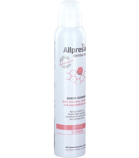 Anwendungsgebiet von Allpresan Derma Med Atopix Shower DuschschaumAllpresan Derma Med Atopix Shower Duschschaum ist eine milde, rückfettende Reinigung mit biomimetischen Lipiden, Glycerin, Mandel- und Jojobaöl, geeignet zur therapiebegleitenden Pflege bei Neurodermitis.
