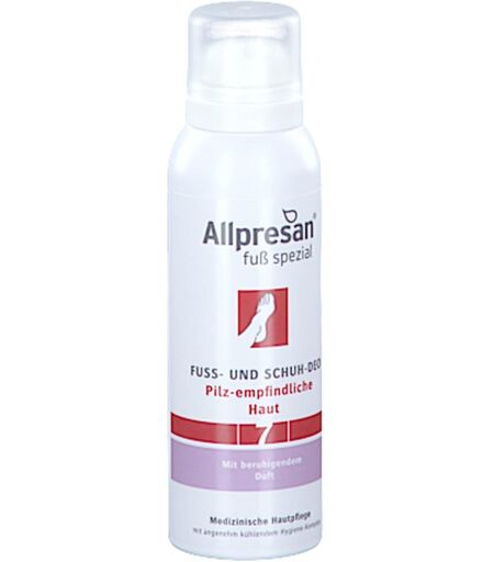 Anwendungsgebiet von Allpresan Fuß Spezial Nummer 7 Fuß- und Schuh-Deo Allpresan Fuß Spezial Nummer 7 Fuß- und Schuh-Deo beseitigt unangenehme Gerüche und sorgt für ein hygienisch frisches Fußklima. Die enthaltenen anti-mikrobiellen Komponenten bekämpfen geruchsbildende Bakterien, reduzieren so die Entstehung unangenehmer Gerüche und tragen zudem dazu bei, das Risiko für das Eindringen von Pilzsporen und Bakterien zu verringern. Die Gefahr, sich in den eigenen Schuhen mit Fuß- und Nagelpilz anzustecken, wird effektiv reduziert. Methyllaktat besitzt zudem angenehm kühlende Effekte. Mit Piroctone Olamine. Wirkstoffe / Inhaltsstoffe / ZutatenInhaltsstoffe von Allpresan Fuß Spezial Nummer 7 Fuß- und Schuh-Deo : Butane, Alcohol denat., Propane, Isopropyl Myristate, Parfum, Decylene Glycol, Piroctone Olamine, Menthyl Lactate, Limonene, Hexyl Cinnamal, Alpha-Isomethyl Ionone, Citronellol, Hydroxycitronellal, Linalool, Geraniol, Benzyl Alcohol, Benzyl Salicylate. GegenanzeigenBei bekannter Überempfindlichkeit gegen einzelne Inhaltsstoffe sollte Allpresan Fuß Spezial Nummer 7 Fuß- und Schuh-Deo nicht angewendet werden.DosierungAnwendungsempfehlung von Allpresan Fuß Spezial Nummer 7 Fuß- und Schuh-Deo : Vor Gebrauch gut schütteln. Täglich bzw. nach Bedarf anwenden. Das Fußdeo dabei aus ca. 15 cm Entfernung gleichmäßig auf die Füße aufsprühen. Bei Anwendung als Schuhdeo, die Schuhe idealerweise abends von innen einsprühen und über Nacht trocknen lassen. Nach der Anwendung können Socken und Schuhe problemlos angezogen werden. Allpresan Fuß Spezial Nummer 7 Fuß- und Schuh-Deo können in Ihrer Versandapotheke www.apolux.de erworben werden. ...