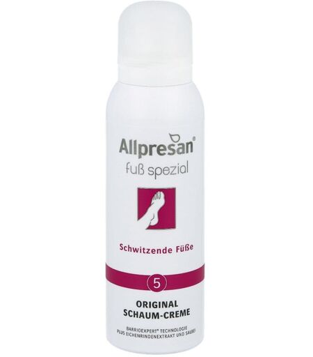 Anwendungsgebiet von Allpresan Fuss spezial Nummer 5 schwitzende FüsseAllpresan Fuss spezial Nummer 5 schwitzende Füsse hilft bei Fußschweiß.Wirkungsweise von Allpresan Fuss spezial Nummer 5 schwitzende FüsseSchwitzende Füße sind unangenehm und können stark riechen. Mit Allpresan Fuss spezial Nummer 5 schwitzende Füsse bereiten Sie Ihrem Fußschweiß ein Ende. Allpresan Fuss spezial Nummer 5 schwitzende Füsse mindert die übermäßige Schweißproduktion und pflegt zugleich Ihre Füße seidig weich. Die Formel aus Salbei und Eichenrindenextrakt verändert zudem die Funktion der Haut nicht. Ihre Füße sind angenehm trocken. Dabei zieht Allpresan Fuss spezial Nummer 5 schwitzende Füsse schnell ein und fettet nicht nach. Allpresan Fuss spezial Nummer 5 schwitzende Füsse ist dermatologisch getestet.Wirkstoffe / Inhaltsstoffe / ZutatenInhaltsstoffe von Allpresan Fuss spezial Nummer 5 schwitzende Füsse: