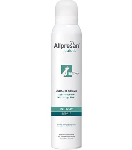 Allpresan diabetic INTENSIV + REPAIR Schaum-Creme mit UreaDie Allpresan diabetic INTENSIV + REPAIR Schaum-Creme mit 8 % Urea ist speziell für die Pflege von sehr trockener und rissiger Haut bei Diabetes entwickelt worden. Diese Schaum-Creme versorgt die Haut intensiv mit Feuchtigkeit und unterstützt die Reparatur der Hautbarriere innerhalb von nur 4 Wochen. Die einzigartige Formel kombiniert die intensive Feuchtigkeitsversorgung mit dem Repair-Effekt biomimetischer Lipide. Dank der leichten Schaumtextur zieht die Creme schnell ein und hinterlässt ein angenehmes Hautgefühl, ohne zu fetten. Die Allpresan diabetic INTENSIV + REPAIR Schaum-Creme ist ideal zur Anwendung an Füßen und Beinen und hilft, die natürliche Schutzfunktion der Haut wiederherzustellen und die hauteigene Regeneration zu fördern. Diabetische HautpflegeDie Fußhaut von Menschen mit Diabetes ist aufgrund verschiedener, auf die Erkrankung zurückzuführender Gründe häufig extrem trocken. Der Hautbarriere mangelt es an wichtigen Lipiden, die einen weiteren Feuchtigkeitsverlust verhindern. Diese Trockenheit kann zu rissiger und gereizter Haut führen, was das Risiko von Infektionen erhöht und die Lebensqualität beeinträchtigt.Die Allpresan diabetic INTENSIV + REPAIR Schaum-Creme mit Urea vereint die intensive Feuchtigkeitsversorgung der Allpresan diabetic INTENSIV mit dem Repair-Effekt biomimetischer Lipide. Die gestörte Hautbarriere wird nachweislich innerhalb von nur 4 Wochen repariert. Das Ergebnis: die natürliche Schutzfunktion der Hautbarriere wird wiederhergestellt. Zudem wird die hauteigene Regeneration gefördert, was zur nachhaltigen Verbesserung der Hautsituation beiträgt.Durch die regelmäßige Anwendung der Allpresan diabetic INTENSIV + REPAIR Schaum-Creme wird die Haut weich und geschmeidig, und das Risiko von Hautproblemen, die durch Diabetes bedingt sind, wird reduziert. Diese spezielle Pflegeformel hilft dabei, die Hautgesundheit zu erhalten und die Lebensqualität von Menschen mit Diabetes zu verbessern.Modo d'usoIdealerweise sollte die Allpresan diabetic Schaum-Creme INTENSIV + REPAIR 2 x täglich (morgens und abends) bzw. nach Bedarf auf die sehr trockenen bis schuppigen Haut aufgetragen werden, um die diabetische Fußhaut optimal zu pflegen. Eine kleine Menge genügt bereits für größere Hautpartien. Die Allpresan diabetic Schaum-Creme INTENSIV + REPAIR zieht schnell ein und fettet nicht, sodass Kleidung direkt wieder angezogen werden kann. Das Produkt ist nur zur äußeren Anwendung geeignet. Bitte schütteln Sie die Schaum-Creme Dose vor Gebrauch gut und halten Sie sie bei Entnahme aufrecht. Vor dem ersten Gebrauch sollten Sie das Originalitätssiegel auf der Rückseite des Schaumkopfes entriegeln.IngredientiAqua, Urea, Decyl Oleate, Octyldodecanol, Butane, Glycerin, Panthenol, Cetyl Alcohol, Propane, Stearic Acid, Glyceryl Stearate, Hydrogenated Lecithin, Caprylic/Capric Triglyceride, Ceramide NP, Squalane, Saccharide Isomerate, Butyrospermum Parkii Butter, Allantoin, Potassium... ...