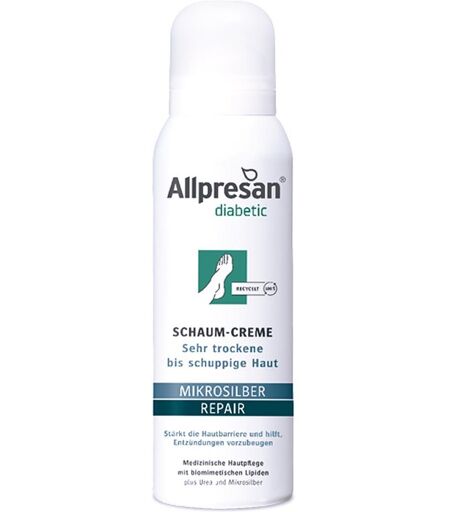 Anwendungsgebiet von Allpresan Diabetic Mikrosilber+Repair Schaum-CremeAllpresan Diabetic Mikrosilber+Repair Schaum-Creme ist eine medizinische Hautpflege bei Diabetes mellitus mit biomimetischen Lipiden plus Urea und Mikrosilber - stärkt die Hautbarriere und versorgt die sehr trockene bis schuppige Haut intensiv mit Feuchtigkeit.