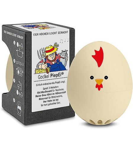 Das Gockel PiepEi spielt drei verschiedene Melodien für drei Härtegrade OLD MACDONALD - für Weicheier MEINE OMA FÄHRT IM HÜHNERST... - für mittelweiche Eier DER HAHN IST TOT - für harte Eier So werden perfekte Eier gekocht: 1. PiepEi mit Hühnereiern zusammen lagern 2. PiepEi und Hühnereier zeitgleich in den Kochtopf legen 3. Zusammen kochen bis die entsprechende Melodie spielt 4. Eier und PiepEi unter kaltem Wasser abschrecken Warnhinweis: Das PiepEi bitte nie in die Mikrowelle geben, es wäre sein Tod. Auch ein Topf ohne Wasser ist sehr ungesund für das PiepEi (PiepEi muss schwimmen). Sollte PiepEi jemals verformt sein, bitte nicht mehr benutzen. PiepEi nicht öffnen, nie in offenes Feuer legen, nicht in den Mund nehmen. Nur zum Eier kochen verwenden. Der Garantiezeitraum beträgt zwei Jahre und gilt ab Verkauf. Ertönt zum Anfang (bei ca. 45°C) kein kurzer Piepton mehr, ist die Batterie leer. Dann bitte PiepEi über das Batterierücknahme-System entsorgen. PiepEi ist auf Lebensmitteltauglichkeit geprüft. Bei Lagerung im Kühlschrank (zusammen mit den echten Eiern) hält Ihr PiepEi besonders lange. ...