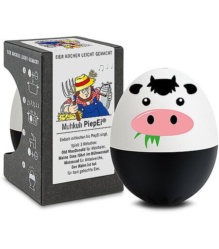 Das Muhkuh PiepEi spielt drei verschiedene Melodien für drei Härtegrade OLD MACDONALD - für Weicheier MEINE OMA FÄHRT IM HÜHNERST... - für mittelweiche Eier DER HAHN IST TOT - für harte Eier So werden perfekte Eier gekocht: 1. PiepEi mit Hühnereiern zusammen lagern 2. PiepEi und Hühnereier zeitgleich in den Kochtopf legen 3. Zusammen kochen bis die entsprechende Melodie spielt 4. Eier und PiepEi unter kaltem Wasser abschrecken Warnhinweis: Das PiepEi bitte nie in die Mikrowelle geben, es wäre sein Tod. Auch ein Topf ohne Wasser ist sehr ungesund für das PiepEi (PiepEi muss schwimmen). Sollte PiepEi jemals verformt sein, bitte nicht mehr benutzen. PiepEi nicht öffnen, nie in offenes Feuer legen, nicht in den Mund nehmen. Nur zum Eier kochen verwenden. Der Garantiezeitraum beträgt zwei Jahre und gilt ab Verkauf. Ertönt zum Anfang (bei ca. 45°C) kein kurzer Piepton mehr, ist die Batterie leer. Dann bitte PiepEi über das Batterierücknahme-System entsorgen. PiepEi ist auf Lebensmitteltauglichkeit geprüft. Bei Lagerung im Kühlschrank (zusammen mit den echten Eiern) hält Ihr PiepEi besonders lange. ...