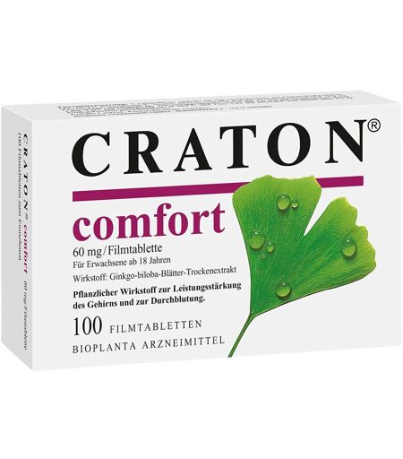 Craton comfort 60 mg / Filmtablette Für Erwachsene ab 18 Jahren Wirkstoff: Ginkgo-biloba-Blätter-Trockenextrakt Anwendungsgebiete: Zur Behandlung von Beschwerden bei durch altersbedingte Arterienverengung hirnorganisch bedingten geistigen Leistungsstörungen im Rahmen eines therapeutischen Gesamtkonzeptes mit den Hauptbeschwerden: Rückgang der Gedächtnisleistung, Merkfähigkeit und Konzentration, Kopfschmerzen, Schwindelgefühle, Ohrensausen. Bevor die Behandlung mit Ginkgo-Extrakt begonnen wird, sollte geklärt werden, ob die Krankheitsbeschwerden nicht auf einer spezifisch zu behandelnden Grunderkrankung beruhen. ...