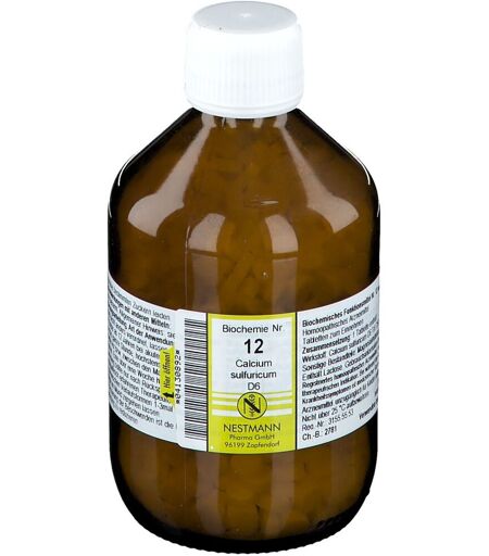 Zusammensetzung: 1 Tablette enthält: Arzneilich wirksamer Bestandteil: Calcium sulfuricum Trit. D6 bzw. D12 250 mg Sonstige Bestandteile: Lactose, Magnesiumstearat, Kartoffelstärke.. Tabletten, Originalpackung mit 100, 400 und 1000 Tabletten. Anwendungsgebiete: Registriertes homöopathisches Arzneimittel, daher ohne Angabe einer therapeutischen Indikation. Hinweis: Bei während der Anwendung des Arzneimittels fortdauernden Krankheitssymptomen ist medizinischer Rat einzuholen. Dosierungsanleitung, Art der Anwendung: Soweit nicht anders verordnet, Bei akuten Zuständen alle halbe bis ganze Stunde, höchstens 12mal täglich je 1 Tablette sowie bei chronischen Verlaufsformen 1-3mal täglich je 1 Tablette vor bzw. zwischen den Mahlzeiten im Mund zergehenlassen. Kleinkinder bis zum 6. Lebensjahr erhalten nicht mehr als die Hälfte, Kinder zwischen dem 6. und 12. Lebensjahr erhalten nicht mehr als zwei Drittel der Erwachsenendosis. Säuglinge bis zum 1. Lebensjahr erhalten nach Rücksprache mit einem Arzt nicht mehr als ein Drittel der Erwachsenendosis. ...