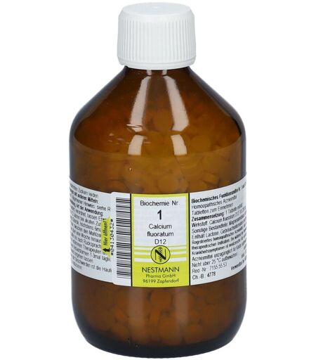 Zusammensetzung: 1 Tablette enthält: Arzneilich wirksamer Bestandteil: Calcium fluoratum Trit. D6 bzw. D12 250 mg Sonstige Bestandteile: Lactose, Magnesiumstearat, Kartoffelstärke.. Tabletten, Originalpackung mit 100, 400 und 1000 Tabletten. Anwendungsgebiete: Registriertes homöopathisches Arzneimittel, daher ohne Angabe einer therapeutischen Indikation. Hinweis: Bei während der Anwendung des Arzneimittels fortdauernden Krankheitssymptomen ist medizinischer Rat einzuholen. Dosierungsanleitung, Art der Anwendung: Soweit nicht anders verordnet, Bei akuten Zuständen alle halbe bis ganze Stunde, höchstens 12-mal täglich je 1 Tablette sowie bei chronischen Verlaufsformen 1 - 3-mal täglich je 1 Tablette vor bzw. zwischen den Mahlzeiten im Mund zergehenlassen. Kleinkinder bis zum 6. Lebensjahr erhalten nicht mehr als die Hälfte, Kinder zwischen dem 6. und 12. Lebensjahr erhalten nicht mehr als zwei Drittel der Erwachsenendosis. Säuglinge bis zum 1. Lebensjahr erhalten nach Rücksprache mit einem Arzt nicht mehr als ein Drittel der Erwachsenendosis. ...