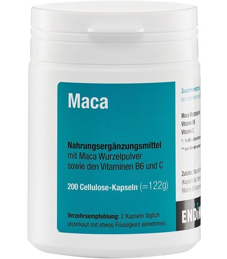 Nahrungsergänzungsmittel sind kein Ersatz für eine ausgewogene und abwechslungsreiche Ernährung und eine gesunde Lebensweise.Endima® Maca 500 mg KapselnNahrungsergänzungsmittel mit 500 mg Maca Wurzelpulver pro Kapsel sowie den Vitaminen B6 und C. Vitamin C leistet einen Beitrag zur normalen Funktion des Immunsystems sowie zur Verringerung von Müdigkeit und Ermüdung. Vitamin B6 trägt zur Regulation der Hormontätigkeit bei.Zutaten:Maca Wurzelpulver 81%, Hydroxypropylmethylcellulose (Kapselhülle), Vitamin C, Trennmittel Magnesiumsalze von Speisefettsäuren, Vitamin B6-hydrochlorid. Zusammensetzung pro empf. tägl. Verzehrsmenge (2 Kapseln) Maca Wurzelpulver 1.000,00 mg ** Vitamin B6 0,42 mg 30%* Vitamin C 24,00 mg 30%* *: % NRV = Nährstoffbezugswerte gemäß Lebensmittelinformationsverordnung **: kein NRV-Wert vorliegendVerzehrsempfehlung:2 Kapseln täglichunzerkaut mit etwas Flüssigkeit einnehmen.Hinweis:Die angegebene empfohlene Verzehrempfehlung darf nicht überschritten werden.Aufbewahrung:Dose immer gut verschlossen, kühl, trocken und außerhalb der Reichweite von kleinen Kindern aufbewahren.Nettofüllmenge:200 Cellulose-Kapseln (=122g)Herstellerdaten:Endima GmbHZeppelinstraße 21 a66557 Illingen ...