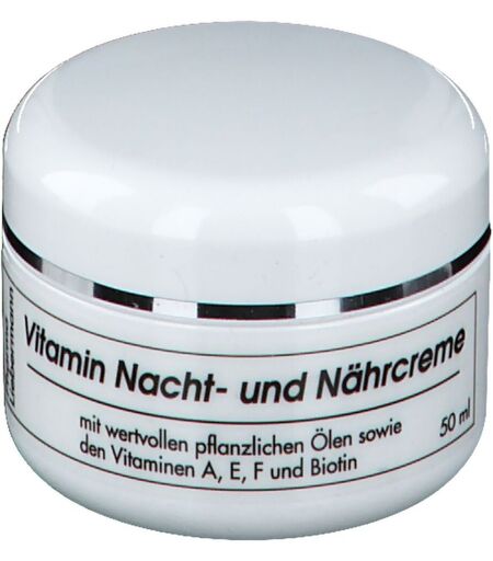 EIGENSCHAFTENDiese vitaminreiche und gehaltvolle Nachtcreme spendet trockener, anspruchsvoller Haut die notwendigen Nährstoffe zur wohltuenden nächtlichen Regeneration.Hochwertige naturreine pflanzliche Öle und Fette (Pfirsichkernöl, Aloe-vera-Öl, Jojabaöl, Avocadoöl und Nachtkerzenöl) bieten strapazierter Haut eine hervorragende Pflege. Bei sehr trockener Haut kann Vitamin Nacht- und Nährcreme auch für die Anwendung am Tage empfohlen werden.Die wichtigen Vitamine A, E und F verhindern Hautprobleme wie Fettarmut, mangelnde Elastizität und eine schuppige Oberflächen-struktur, die besonders bei reiferer Haut auftreten können. Hautentzündungen und Ekzemen wird vorgebeugt.Vitamin Nacht- und Nährcreme enthält zudem wertvolles Biotin (=Vitamin H), einen wesentlichen Wachstumsfaktor für die Hauterneuerung, und wirkt dadurch trockener, rauher und abschuppender Haut sowie Talgdrüsenunterfunktion entgegen.ZUSAMMENSETZUNGenthält u.a. Avocadoöl, Aloe-vera-Öl, Pfirsichkernöl, Jojobaöl, Nachtkerzenöl, natürliche Feuchtigkeitsfaktoren (NMF), Vitamine A, E und F, Biotin (Vitamin H).Ingredients:Aqua, Decyl Oleate, Petrolatum, Cera Microcristallina, Simmondsia Chinensis Oil1, Dicocoyl Pentaerythrityl Distearyl Citrate, Paraffinum, Hydrogenated Coco-Glycerides, Prunus Persica Kernel Oil2, Glycine Soja, Sorbitan Sesquioleate, Persea Gratissima Oil3, Propylene Glycol, Urea4, Cetyl PEG/PPG-10/1 Dimethicone, Cyclopentasiloxane, Cyclohexasiloxane, Magnesium Sulfate, Sodium Lactate4, Sodium PCA4, Tocopheryl Acetate5, Oenothera Biennis Oil6, Cera Alba, Parfum, Aloe Barbadensis7, Aluminium/Magnesium Hydroxide Stearate, Glyceryl Linolenate8, Glyceryl Linoleate8, Tocopherol, Retinyl Palmitate9, Helianthus Annus, Aluminium Stearates, Biotin, Propylene Carbonate, Benzyl Alcohol, Glycerin, Benzoid Acid, Sorbic Acid, Citronellol*, Eugenol*, Geraniol*, Hexyl Cinnamal*, Hydroxycitronellal*, Isoeugenol*, Alpha-Isomethylionone*, Cinnamyl Alcohol*.*) Parfümbestandteile1 Jojobaöl, 2 Pfirsichkernöl, 3 Avocadoöl, 4 natürliche Feuchtigkeitsfaktoren, 5 Vitamin E, 6 Nachtkerzenöl, 7 Aloe vera Öl, 8 Vitamin F, 9 Vitamin A. ...