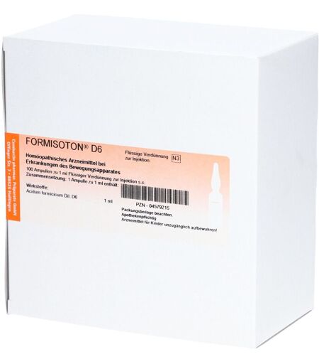 FORMISOTON® D6Flüssige Verdünnung zur InjektionWirkstoff: Acidum formicicum D6:Stoff- oder Indikationsgruppe:Homöopathisches Arzneimittel bei Erkrankungen des Bewegungsapparates.Anwendungsgebiete:Die Anwendungsgebiete entsprechen dem homöopathischen Arzneimittelbild.Dazu gehören Rheumatismus der Muskeln und Gelenke; zur Folgetherapie nach abgeschlossener Initialbehandlung (siehe Schema unter Dosierungsanleitung).Hinweis:Bei anhaltenden oder neu auftretenden Beschwerden, sowie bei akuten Gelenkbeschwerden, die mit Rötung, Schwellung oder Überwärmung von Gelenken einhergehen, sollte ein Arzt aufgesucht werden.Gegenanzeigen:Wann dürfen Sie FORMISOTON® D6 nicht anwenden? Nicht anwenden bei Überempfindlichkeit gegen Ameisensäure.FORMISOTON® D6 sollte nicht bei Patienten im akuten Gichtanfall eingesetzt werden, da die Symptomatik sich auf andere, bisher nur latent erkrankte Gelenke ausdehnen könnte.Vorsichtsmaßnahmen für die Anwendung:Was müssen Sie in der Schwangerschaft und Stillzeit beachten?Da keine ausreichend dokumentierten Erfahrungen vorliegen, sollte FORMISOTON® D6 in der Schwangerschaft und Stillzeit nur nach Rücksprache mit dem Arzt angewendet werden. Was ist bei Kindern zu berücksichtigen?Zur Anwendung dieses Arzneimittels bei Kindern liegen keine ausreichend dokumentierten Erfahrungen vor. Es soll deshalb bei Kindern unter 12 Jahren nicht angewendet werden.Wechselwirkungen mit anderen Arzneimitteln oder anderen Mitteln:Keine bekannt.Allgemeiner Hinweis:Die Wirkung eines homöopathischen Arzneimittels kann durch allgemein schädigende Faktoren in der Lebensweise und durch Reiz- und Genussmittel ungünstig beeinflusst werden. Falls Sie sonstige Arzneimittel anwenden, fragen Sie Ihren Arzt.Dosierungsanleitung, Art und Dauer der Anwendung:Soweit nicht anders verordnet:Erwachsene und Jugendliche ab 12 Jahren:Täglich bis mehrtägig 1 Ampulle subcutan injizieren; bei kleineren Gelenken, wie z.B. beim Kiefergelenk (Costen-Syndrom), eine halbe Ampulle subcutan.Bei Arthrosen hat sich folgendes Schema bewährt:1. Woche2. Wocheab der 3. WocheFORMISOTON® D4Täglich2-tägigFORMISOTON® D6-1-2 wöchentlichAuch homöopathische Arzneimittel sollten ohne ärztlichen Rat nicht über längere Zeit angewendet werden.Überdosierung und andere Anwendungsfehler:Wenn Sie eine größere Menge FORMISOTON® D6 angewendet haben, als Sie sollten, sind in der Regel keine nachteiligen Folgen zu erwarten.Wenn Sie die Anwendung von FORMISOTON® D6 vergessen haben, holen Sie diese bitte nach, sobald Sie es bemerken. Wenden Sie aber nicht die doppelte Dosis an.Wenn Sie die Anwendung von FORMISOTON® D6 abbrechen,können sich Ihre Beschwerden wieder verschlimmern oder erneut auftreten. Wenn Sie weitere Fragen zur Anwendung des Arzneimittels haben, fragen Sie Ihren Arzt, Ihren Apotheker oder einen homöopathisch erfahrenen Therapeuten.Nebenwirkungen:Keine bekannt.Hinweise:Bei der Anwendung eines homöopathischen Arzneimittels können sich die vorhandenen Beschwerden vorübergehend verschlimmern... ...