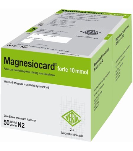 Ein Mangel an dem lebenswichtigen Mineralstoff Magnesium kann viele Ursachen haben, z.B. einseitige Ernährungsgewohnheiten, ein erhöhter Magnesiumbedarf (z.B. Schwangerschaft, Stillzeit) oder erhöhte Verluste an Magnesium, z.B. bei Diabetes mellitus oder bedingt durch Alltagsstress. Aufgrund der umfangreichen Funktionen von Magnesium im Organismus kann sich ein Mangel an allen Ecken und Enden bemerkbar machen, z.B. Waden- und Zehenkrämpfe, Verspannungen im Nacken-, Schulter- und Rückenbereich, Lidzucken, Nervosität, innere Unruhe, Kopf- und Herzschmerzen oder vorzeitige Wehen in der Schwangerschaft. Magnesiocard® enthält die spezielle, patentgeschützte Magnesiumverbindung Magnesiumaspartat-hydrochlorid, die sehr gut vom Körper aufgenommen wird. Sie erhalten Magnesiocard® je nach Geschmack und Bedarf in unterschiedlichen Darreichungsformen (Filmtabletten, Pulver zum Trinken, Brausetabletten, Beutel mit retardierten Filmtabletten) und Wirkstoffstärken rezeptfrei in Ihrer Apotheke. Die Magnesiocard®-Produkte sind so dosiert, dass sie auch mehrmals pro Tag eingenommen werden können. Dies hat den Vorteil einer bestmöglichen Aufnahme von Magnesium in den Körper, da kleine Mengen - mehrmals täglich eingenommen - besser aufgenommen werden können als große Einmal-Dosierungen. Alle Magnesiocard® Produkte sind glutenfrei und enthalten keine Lactose. Anwendung:Magnesiocard® Arzneimittel sind die idealen Produkte zur Behandlung bei Magnesiummangel. Es wird insbesondere angewendet bei Magnesiummangel-bedingten Herzbeschwerden, bei durch Diabetes mellitus (Zuckerkrankheit) bedingten Magnesiummangel sowie bei Magnesiummangel bei hyperaktiven Kindern. Für nähere Informationen fordern Sie bitte unsere Magnesiocard® Patienteninformationen an. Auch in der Schwangerschaft wird Magnesiocard® aufgrund klinischer Erfahrungen häufig eingesetzt. Die Schwangerschaft - wenn zwei Herzen schlagen - ist eine klassische Magnesiummangel-Situation: ein Magnesiummangel kann hier zu Wadenkrämpfen und sogar zu vorzeitigen Wehen führen. Magnesiocard® forte 10 mmol, Pulver:2460 mg Magnesiumaspartat-hydrochlorid 3 H2O, entsprechend 243 mg Magnesium pro Beutel.Wirkstoff:Magnesiumaspartat-hydrochlorid Anwendungsgebiete:Behandlung von therapiebedürftigen Magnesium-Mangelzuständen, die keiner Injektion/Infusion bedürfen. Nachgewiesener Magnesiummangel, wenn er Ursache für Störungen der Muskeltätigkeit (neuromuskuläre Störungen, Wadenkrämpfe) ist. Hinweise:Magnesiocard 7,5 mmol: enthält Aspartam, Natrium- und Kaliumverbindungen ...