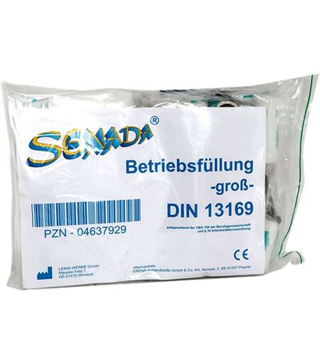 Senada® Füllung nach DIN 13169 Produkt Anzahl Porena Fixierbinde, 4 m x 6 cm 4 Porena Fixierbinde, 4 m x 8 cm 4 Senada Schere 1 Erena-Vlies-Kompresse steril 10 x 10 cm 2 Stk. 4 Senada Dreiecktuch 4 Senada Wundschnellverband 10 x 6 cm 8 Stk. 2 Senada Heftpflasterspule 5 m x 2,5 cm 2 Senada Erste Hilfe Broschüre 1 Senada Pflasterstrip 19 x 72 mm 4 Stk. 2 Senada Pflasterstrip 25 x 72 mm 4 Stk. 4 Senada Kälte-Sofortkompresse 200cm² 2 Senada Fingerkuppenverband 4 x 7 cm 4 Stk. 2 Senada verschließbarer Folienbeutel 30 x 40 cm 4 Senada Augenkompresse steril 56 x 72 mm 4 Senada Safety Einmalhandschuhe 4 Stk. 2 Senada Rettungsdecke 210 x 160 cm 2 Senada Vliesstofftuch 20 x 30 cm 5 Stk. 1 Senada Verbandpäckchen DIN 13151-K 2 Senada Verbandpäckchen DIN 13151-M 6 Senada Verbandpäckchen DIN 13151-G 2 Senada Verbandtuch 60 x 80 cm 2 Inhaltsverzeichnis 1 ...