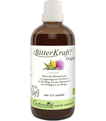 Bitte achten Sie auf eine abwechslungsreiche und ausgewogene Ernährung und gesunde Lebensweise.BitterKraft!® Original flüssig Von der Blüte bis zur Wurzel Bitterstoffe sind über die Jahrhunderte immer mehr in Vergessenheit geraten, ausunserem gängigen Gemüse- und Obstsorten wurden sie sogar größtenteilsherausgezüchtet. Und das alles damit es uns besser schmeckt, obwohl dieWirksamkeit und auch die gesundheitlichen Eigenschaften durch die Züchtungen mehrund mehr verloren gehen. Mit unserer Arbeit sorgen wir dafür, dass die Notwendigkeit der Bitterstoffe wiedererkannt wird. Wir möchten, dass man sich im Alltag über den bitteren Geschmack freut und dassBitterstoffe in jedem Haushalt bewährte Begleiter sind. Wieso soll man an Perfektion etwas ändern? Bitterstoffe sind vertraute Favoriten fürjeden Tag. Traditionelles Heilwissen Traditionelle Anwendung finden Bitterstoffe bei Magenbeschwerden, Völlegefühl oderBlähbauch. Bei regelmäßiger Anwendung kann auch das Verlangen nach Süßemvermindert werden. Zusätzlich fand man heraus, dass Bitterstoff-Rezeptoren nicht nur im Verdauungstraktangesiedelt sind, sondern sich auch auf der Haut befinden. In unserer Kosmetikafindet dieses Wissen Anwendung. Mit ihrer einzigartigen Rezeptur aus ausgewählten Kräutern, Gewürzen, Wurzeln undBlüten schafft BitterKraft!®Original außergewöhnliche Genussmomente. Daher immer wieder mal vor dem Essen 10 -15 Tropfen pur oder mit Saft verdünnttrinken. Bei akuten Magenbeschwerden empfiehlt sich den Kräuterbitter pur zukonsumieren. Geschüttelt, nicht gerührt! Zu Hildegards Kräuterwissen gehört insbesondere, dass feinbittere Kräuter besondereEigenschaften haben. Und BitterKraft!®Original ist etwas Besonderes. Die erlesenenPflanzen werden über Wochen lang kalt angesetzt. Sie sind nicht klar filtriert, d.h. BitterKraft!®Original schmeckt wie reine Natur. Daher sollte der Kräuterbitter vorgebrauch gut geschüttelt werden, damit sich die Inhaltstoffe wieder gut verteilen. Zutaten:Wasser* Alkohol* Extrakte aus: Angelikawurzel* Enzianwurzel* Kardamomsamen* Kurkuma* Zimtrinde* Galgant* Ingwer* Artischocke* Mariendistelkraut* Alk*. 22%vol. * = aus kontrolliert biologischem Anbau Verzehrempfehlung: Vor dem Essen 10-15 Tropfen im Mund zergehen lassen. Pur oder mit Wasser verdünnt.Nettofüllmenge: 100 mlHerstellerdaten:Gutsmiedl Produkte GmbHHohenwarter Str. 25D-85276 Pfaffenhofen ...