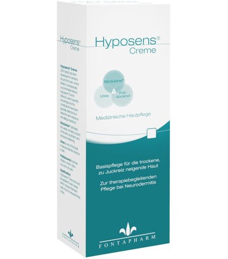 Schnell einziehende einzigartige Wirkstoffkombination zur täglichen Anwendung auf kleine bis mittelgroße Körperflächen bei extrem trockener Haut mit Juckreiz und Hautrötung - auch zur Therapiebegleitenden Pflege bei Neurodermitis und Altersjuckreiz. Hyposens® Creme (26% Lipide) zur täglichen Pflege bei Neurodermitis, trockener, juckender Haut und Altershaut. Hautprobleme treten heute quer durch alle Altersklassen häufiger denn je auf. Fast zwei Drittel aller Kinder unter 10 und fast alle Menschen über 60 Jahre haben empfindliche, trockene und juckende Haut. Die natürliche Hautbarrierefunktion der Haut kann durch die täglichen Belastungen wie z.B. durch schädliche Umwelteinflüsse, Kälte, trockene Heizungsluft und Stress gestört sein. Auch häufiges Waschen setzt der Haut zu. Seife, Wasch- und Reinigungsmittel entziehen der Haut Fett und Feuchthaltefaktoren, die von der Haut normalerweise leicht ausgeglichen werden. Bei einer verminderten Hautbarrierefunktion erfolgt dieser Ausgleich jedoch sehr viel langsamer. Ist die Barrierefunktion der Haut nicht mehr intakt, verliert die Haut zunehmend an Feuchtigkeit. Es entstehen die typischen Symptome trockener Haut: Hautrauhigkeit, Spannungsgefühl, Schuppung, Risse und Juckreiz. Hyposens® Creme wurde für die empfindliche, trockene und juckende Haut entwickelt, denn Juckreiz ist eine besonders quälende Begleiterscheinung der trockenen Haut. Die Zusammensetzung entspricht aktuellen wissenschaftlichen Erkenntnissen. Die Inhaltsstoffe von Hyposens® sind speziell ausgesucht und auf ihre Hautverträglichkeit unter allergologischen Aspekten geprüft. Hyposens® Creme enthält Harnstoff (Urea) der als natürlicher Bestandteil der Feuchthaltefaktoren in der Haut vorkommt. Er ist in der Lage, das Wasserbindungsvermögen in der Haut zu erhöhen. Polidocanol wirkt dem bei trockener und juckender Haut auftretenden lästigen Juckreiz entgegen. Modukine® reduziert Hautrötungen, beruhigt die Haut und hilft den Cortisonbedarf zu senken. Anwendungsgebiet: Zur Feuchtigkeitsregulierung der Hornschicht, Fettung und Juckreizstillung für die sehr trockene, juckende Haut und Altershaut. Therapiebegleitend bei Neurodermitis, Waschekzem und Puritus senilis. pH-Wert: 5,8 - 6,4 Anwendung: Hyposens® Creme sollte ein- bis mehrmals täglich auf Hautpartien, die einer intensiven Pflege bedürfen, aufgetragen werden. Sie hinterlässt keinen Fettglanz und zieht rasch ein. Zusammensetzung:Wirkstoffe: Urea, Polidocanol, Modukine®Sonstige Bestandteile:Aqua, Octyldodecanol, Urea, Paraffinum Liquidum, Isopropyl Palmitate, Pentylene Glycol, Laureth-9, Stearic Acid, Palmitic Acid, Dimethicone, Polysorbate 60, Lactose, Lactis Proteinum, Carbomer, Triethanolamine, Tocopherol. Hinweis: Über eine Langzeitanwendung sprechen Sie bitte mit Ihrem Arzt oder Apotheker. Nicht mit Augen und Schleimhäuten in Berührung bringen. Nur zur äußerlichen Anwendung bestimmt. Nicht auf offene Hautstellen auftragen. Hyposens® Creme ist frei von: Konservierungsstoffen, Lanolin,... ...