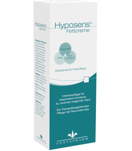 Schnell einziehende einzigartige Wirkstoffkombination zur täglichen Anwendung auf kleine bis mittelgroße Körperflächen bei extrem trockener Haut mit Juckreiz und Hautrötung - auch zur Therapiebegleitenden Pflege bei Neurodermitis und Altersjuckreiz. Hyposens® Fettcreme mit starker Rückfettung (59% Lipide) zur täglichen Pflege bei Neurodermitis, trockener, juckender Haut und Altershaut. Hautprobleme treten heute quer durch alle Altersklassen häufiger denn je auf. Fast zwei Drittel aller Kinder unter 10 und fast alle Menschen über 60 Jahre haben empfindliche, trockene und juckende Haut. Die natürliche Hautbarrierefunktion der Haut kann durch die täglichen Belastungen wie z.B. durch schädliche Umwelteinflüsse, Kälte, trockene Heizungsluft und Stress gestört sein. Auch häufiges Waschen setzt der Haut zu. Seife, Wasch- und Reinigungsmittel entziehen der Haut Fett und Feuchthaltefaktoren, die von der Haut normalerweise leicht ausgeglichen werden. Bei einer verminderten autbarrierefunktion erfolgt dieser Ausgleich jedoch sehr viel langsamer. Ist die Barrierefunktion der Haut nicht mehr intakt, verliert die Haut zunehmend an Feuchtigkeit. Es entstehen die typischen Symptome trockener Haut: Hautrauhigkeit, Spannungsgefühl, Schuppung, Risse und Juckreiz. Hyposens® Fettcreme wurde für die empfindliche, trockene und juckende Haut entwickelt, denn Juckreiz ist eine besonders quälende Begleiterscheinung der trockenen Haut. Die Zusammensetzung entspricht aktuellen wissenschaftlichen Erkenntnissen. Die Inhaltsstoffe von Hyposens® sind speziell ausgesucht und auf ihre Hautverträglichkeit unter allergologischen Aspekten geprüft. Hyposens® Fettcreme enthält Harnstoff (Urea) der als natürlicher Bestandteil der Feuchthaltefaktoren in der Haut vorkommt. Er ist in der Lage, das Wasserbindungsvermögen in der Haut zu erhöhen.Polidocanol wirkt dem bei trockener und juckender Haut auftretenden lästigen Juckreiz entgegen. Modukine® reduziert Hautrötungen, beruhigt die Haut und hilft den Cortisonbedarf zu senken. Anwendungsgebiet: Zur Feuchtigkeitsregulierung der Hornschicht, Fettung und Juckreizstillung für die sehr trockene, juckende Haut und Altershaut. Therapiebegleitend bei Neurodermitis, Waschekzem und Puritus senilis. pH-Wert: 5,7 – 6,4 Anwendung: Hyposens® Fettcreme sollte ein- bis mehrmals täglich auf Hautpartien, die einer intensiven Pflege bedürfen, aufgetragen werden. Sie hinterlässt einen angenehmen feinen Lipidfilm ohne Fettglanz und zieht rasch ein. Zusammensetzung:Wirkstoffe: Urea, Polidocanol, Modukine®Sonstige Bestandteile: Aqua, Octyldodecanol, Paraffinum Liquidum, Cetearyl Alcohol, Dimethicone, Urea, Isopropyl Palmitate, Pentylene Glycol, Polysorbate 60, Stearic Acid, Palmitic Acid, Laureth-9, Lactose, Lactis Proteinum, Tocopherol, Sodium Hydroxide. Hinweis: Nicht mit den Augen und Schleimhäuten in Berührung bringen. Nur zur äußeren Anwendung bestimmt. Nicht auf offene Hautstellen auftragen. Hyposens® Fettcreme ist frei von: Farbstoffen, Duftstoffen,... ...