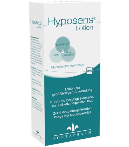 Schnell einziehende einzigartige Wirkstoffkombination zur täglichen Anwendung für den ganzen Körper bei extrem trockener Haut mit Juckreiz und Hautrötung-auch zur Therapie begleitenden Pflege bei Neurodermitis und Altersjuckreiz. Hyposens® Lotion (24% Lipide) zur täglichen Pflege bei Neurodermitis, trockener, juckender Haut und Altershaut. Hautprobleme treten heute quer durch alle Altersklassen häufiger denn je auf. Fast zwei Drittel aller Kinder unter 10 und fast alle Menschen über 60 Jahre haben empfindliche, trockene und juckende Haut. Die natürliche Hautbarrierefunktion der Haut kann durch die täglichen Belastungen wie z.B. durch schädliche Umwelteinflüsse, Kälte, trockene Heizungsluft und Stress gestört sein. Auch häufiges Waschen setzt der Haut zu. Seife, Wasch- und Reinigungsmittel entziehen der Haut Fett und Feuchthaltefaktoren, die von der Haut normalerweise leicht ausgeglichen werden. Bei einer verminderten Hautbarrierefunktion erfolgt dieser Ausgleich jedoch sehr viel langsamer. Ist die Barrierefunktion der Haut nicht mehr intakt, verliert die Haut zunehmend an Feuchtigkeit. Es entstehen die typischen Symptome trockener Haut: Hautrauhigkeit, Spannungsgefühl, Schuppung, Risse und Juckreiz. Hyposens® Lotion wurde für die empfindliche, trockene und juckende Haut entwickelt, denn Juckreiz ist eine besonders quälende Begleiterscheinung der trockenen Haut. Die Zusammensetzung entspricht aktuellen wissenschaftlichen Erkenntnissen. Die Inhaltsstoffe von Hyposens® sind speziell ausgesucht und auf ihre Hautverträglichkeit unter allergologischen Aspekten geprüft. Hyposens® Lotion enthält Harnstoff (Urea) der als natürlicher Bestandteil der Feuchthaltefaktoren in der Haut vorkommt. Er ist in der Lage, das Wasserbindungsvermögen in der Haut zu erhöhen. Polidocanol wirkt dem bei trockener und juckender Haut auftretenden lästigen Juckreiz entgegen. Modukine® reduziert Hautrötungen, beruhigt die Haut und hilft den Cortisonbedarf zu senken. Anwendungsgebiet: Zur Feuchtigkeitsregulierung der Hornschicht, Fettung und Juckreizstillung für die sehr trockene, juckende Haut und Altershaut. Therapiebegleitend bei Neurodermitis, Waschekzem und Puritus senilis. Hauttyp: Trockene Haut. Anwendung: Hyposens® Lotion sollte ein- bis mehrmals täglich auf Hautpartien, die einer intensiven Pflege bedürfen, aufgetragen werden. Sie hinterlässt einen angenehm beruhigenden Kühleffekt und zieht rasch ein. Zusammensetzung: Urea, Polidocanol, Modukine® Aqua, Paraffinum Liquidum, Urea, Pentylene Glycol, Laureth-9, Petrolatum, Cetearyl Alcohol, Sorbitan Stearate, Polysorbate 60, PEG-40 Hydrogenated Castor Oil, Lactose, Lactis Proteinum, Carbomer, Propylene Glycol, Disodium EDTA, Tocopherol, Sodium Hydroxide. ...