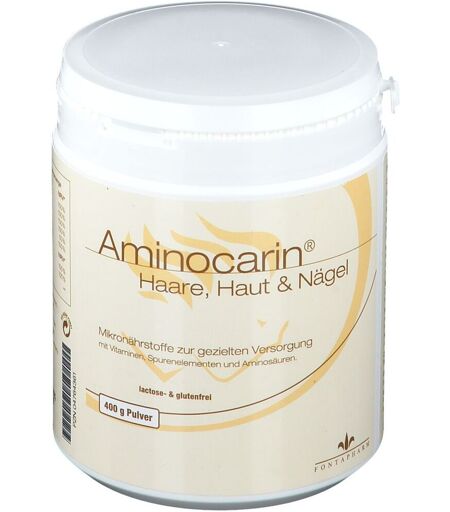 Nahrungsergänzungsmittel sind kein Ersatz für eine ausgewogene und abwechslungsreiche Ernährung und eine gesunde Lebensweise.Aminocarin® PulverSchönes volles Haar, starke Fingernägel und ein gesundes Hautbild sind kein Zufall, sondern weitgehend das Ergebnis einer guten Versorgung mit allen wichtigen Nährstoffen. Bei diffusem Haarausfall, Wachstumsstörungen der Haare und Nägel sowie Adjuvanz bei der Behandlung von Onychomykosen und nach Nagelextraktionen.Zutaten:Kollagen-Hydrolysat, Fructose, Säuerungsmittel: Zitronensäure, natürliches Aroma Orange, Vitaminmischung: (Niacin, Calzium-D-Pantothenat, Vitamin B6, Beta-Carotin, Vitamin B2, Biotin) Geschmacksverstärker: L-Cystin.Nährwerte: Durchschnittliche Nährwerte: Kollagen-Hydrolysat Sonstige Bestandteile:je 13,2 gNiacin18 mgCalzium-D-Pantothenat8,7 mgVitamin B62,1 mgBeta-Carotin2,0 mgVitamin B22,0 mgBiotin300Fructose*Säuerungsmittel*Natürliches Aroma*L-Cystin**Keine AngabeVerzehrsempfehlung:Täglich 2 Teelöffel (ca. 13,3 g) in einem Glas mit frischer Milch, Apfelsaft, Orangensaft oder Wasser (Zimmertemperatur) einrühren und trinken. Um eine möglichst gute Aufnahme zu erreichen, empfehlen wir die Einnahme vor dem Frühstück.Hinweis:Die angegebene empfohlene Tagesmenge darf nicht überschritten werden.Aufbewahrung: Kühl (6-25 °C) und lichtgeschützt lagern. Außerhalb der Reichweite von kleinen Kindern aufbewahren.Nettofüllmenge: 400 gHerstellerdaten: Fontapharm AGVarrel 21D-31303 Burgdorf ...