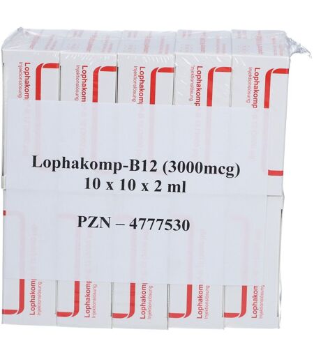 Nahrungsergänzungsmittel sind kein Ersatz für eine ausgewogene und abwechslungsreiche Ernährung und eine gesunde Lebensweise. Zusammensetzung:Lophakomp® (3000 µg) 1 Ampullemit 2 ml Injektionslösung enthält3000 µg CyanocobalaminSonstige Bestandteile:Natriumchlorid, Wasser für Injektionszwecke Stoff- und Indikationsgruppe bzw. Wirkungsweise:Cyanocobalamin und Hydroxocobalaminacetat ge- hören zur Gruppe der Stoffe, die zusammenfassend als “Vitamin B12” bezeichnet werden. Hydroxocobalaminacetat, stellt eine physiologische Depotform des Vitamin B12 dar. Beide Lophakomp®-B12 Injektionslösungen sind ohne Konservierungsmittel. Anwendungsgebiete:Vitamin-B12-Mangel, der ernährungsmäßig nicht behoben werden kann. Vitamin-B12-Mangel kann sich in folgenden Krankheitsbildern äußern: Hyperchromer makrozytärer Megaloblasten- anämie (Perniciosa, Biermer-Anämie, Addison-Anämie) Funikulärer Spinalerkrankung Ein labordiagnostisch gesicherter Vitamin-B12-Man- gel kann auftreten bei: Jahrelanger Mangel- und Fehlernährung (z.B. durch streng vegetarische Kost) Malabsorption ungenügende Produktion von Intrinsic factor Erkrankungen im Endabschnitt des Ileums, z.B. Sprue, Fischbandwurmbefall oder Blind-loop-Syndrom Angeborenen Vitamin-B12-Transportstöungen Gegenanzeigen:Lophakomp®-B12-Depot (1000 µg) darf nicht angewendet werden bei Unverträglichkeit eines Bestandteils. Was muss in Schwangerschaft und Stillzeit beachtet werden?Die empfohlene tägliche Vitamin-B12-Zufuhr in Schwangerschaft und Stillzeit beträgt 4 µg. Nach den bisherigen Erfahrungen haben höhere Anwendungsmengen keine nachteiligen Auswirkungen auf das ungeborene Kind. Vitamin B12 wird in die Muttermilch ausgeschieden. Nebenwirkungen:In Einzelfällen wurden Akne, ekzematöse und urti- karielle Arzneimittelreaktionen sowie anaphylaktische bzw. anaphylaktoide Reaktionen beobachtet. Bisher sind keine Wechselwirkungen bekannt. Dosierungsanleitung und Art der Anwendung:1 ml zweimal wöchentlich (entsprechend 3000 µg Cyanocobalamin). Lophakomp®-B12 wird in der Regel intramuskulär verabreicht. Sie können aber auch langsam intravenös oder subkutan gegeben werden.Bei guter Verträglichkeit ist die Dauer der Anwendung nicht begrenzt. Bei nachgewiesener Vitamin- B12-Aufnahmestörung im Darm wird Vitamin B12 in der Regel lebenslang substituiert. ...