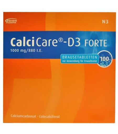Was ist CalciCare®-D3 FORTE und wofür wird es angewendet? CalciCare®-D3 FORTE ist ein Vitamin- und Mineralstoffpräparat CalciCare®-D3 FORTE wird angewendet: als Vitamin D- und Calciumsupplement zur Unterstützung einer spezifischen Therapie, zur Prävention und Behandlung der Osteoporose, zur Vorbeugung und Behandlung von Vitamin D- und Calcium-Mangelzuständen bei älteren Menschen. Wie ist CalciCare®-D3 FORTE einzunehmen? Nehmen Sie CalciCare®-D3 FORTE immer genau nach den Anweisungen dieser Packungsbeilage ein. Fragen Sie bei Ihrem Arzt oder Apotheker nach, wenn Sie nicht ganz sicher sind. Falls vom Arzt nicht anders verordnet, ist die übliche Dosis: einmal täglich 1 Brausetablette. CalciCare®-D3 FORTE darf von Patienten mit schweren Nierenfunktionsstörungen nicht eingenommen werden. Bei Leberfunktionsstörungen ist keine Dosisanpassung erforderlich. Lösen Sie bitte die Brausetablette in einem Glas Trinkwasser auf und trinken Sie den Inhalt des Glases vollständig aus. Wenn Sie eine größere Menge von CalciCare®-D3 FORTE eingenommen haben, als Sie sollten Eine einmalige Überdosierung ist in der Regel folgenlos. Überdosierungserscheinungen sind nur bei dauerhafter, überhöhter Einnahme von CalciCare®-D3 FORTE bzw. zusätzlicher Einnahme anderer Calciumpräparate zur erwarten. Anzeichen einer Überdosierung sind: gesteigertes Durstempfinden und Flüssigkeitsaufnahme, Appetitlosigkeit, Übelkeit, Erbrechen, Verstopfung, Bauchschmerzen, Muskelschwäche, Erschöpfung und krankhaft erhöhte Harnausscheidung. Bei Verdacht auf eine Überdosierung benachrichtigen Sie bitte Ihren Arzt. Er kann entsprechend der Schwere der Überdosierung über die gegebenenfalls erforderlichen Maßnahmen entscheiden. Wenn Sie die Einnahme von CalciCare®-D3 FORTE vergessen haben Nehmen Sie nicht die doppelte Dosis, wenn Sie die vorherige Einnahme vergessen haben, bleiben Sie bei der bisherigen Dosierung. Wenn Sie weitere Fragen zur Anwendung des Arzneimittels haben, fragen Sie Ihren Arzt oder Apotheker. Weitere Information Was CalciCare-D3 FORTE enthält: Die Wirkstoffe sind: 22 Mikrogramm Colecalciferol (entsprechend 880 I.E. Vitamin D3). 2500 mg Calciumcarbonat (entsprechend 1000 mg Calcium) (Die Mengen sind auf 1 Brausetablette bezogen) Die sonstigen Bestandteile sind: α-Tocopherol, Gehärtetes Sojaöl, Gelatine, Sucrose (Zucker), Maisstärke, Wasserfreie Citronensäure, Natriumhydrogencarbonat, Lactose-Monohydrat, Povidon K=25, Saccharin- Natrium, Natriumcyclamat, Macrogol 6000, Orangensaft-Aroma und Simethicon Emulsion, bestehend aus: Dimeticon, Hochdisperses Siliciumdioxid, Methylcellulose. ...