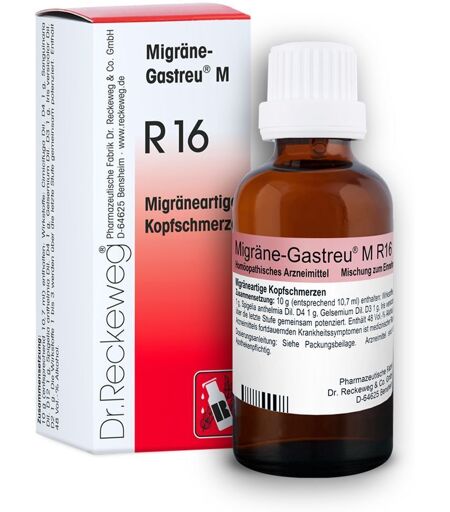 Was ist Migräne-Gastreu® M R 16 und wofür wird es angewendet?Migräne-Gastreu® M R 16 ist ein homöopathisches Arzneimittel bei Erkrankungen des Nervensystems. Anwendungsgebiete: Die Anwendungsgebiete leiten sich von den homöopathischen Arzneimittelbildern ab. Dazu gehören: Besserung der Beschwerden bei migräneartigen Kopfschmerzen. Bei Kopfschmerzen, die länger andauern sowie Sehstörungen, Krämpfen oder Bewusstseinsstörungen sollte ein Arzt aufgesucht werden:Wie ist Migräne-Gastreu® M R 16 anzuwenden? Nehmen Sie Migräne-Gastreu® M R 16 immer genau nach der Anweisung in dieser Packungsbeilage ein. Bitte fragen Sie bei Ihrem Arzt oder Apotheker nach, wenn Sie sich nicht ganz sicher sind. Soweit nicht anders verordnet: Bei akuten Zuständen alle halbe bis ganze Stunde, höchstens 6-mal täglich, je 5 Tropfen einnehmen. Eine über 1 Woche hinausgehende Anwendung sollte nur nach Rücksprache mit einem homöopathisch erfahrenen Therapeuten erfolgen. Bei chronischen Verlaufsformen 1- bis 3-mal täglich je 5 Tropfen einnehmen. Bei Besserung der Beschwerden ist die Häufigkeit der Anwendung zu reduzieren. Dauer der Anwendung: Auch homöopathische Arzneimittel sollten ohne ärztlichen Rat nicht über längere Zeit eingenommen werden. Wenn Sie weitere Fragen zur Anwendung des Arzneimittels haben, fragen Sie Ihren Arzt oder Apotheker.Das Arzneimittel Migräne-Gastreu® M R 16 enthält:10 g (entsprechend 10,7 ml) enthalten: Wirkstoffe: Cimicifuga Dil. D4 1 g, Sanguinaria Dil. D12 1 g, Spigelia anthelmia Dil. D4 1 g, Gelsemium Dil. D3 1 g, Iris versicolor Dil. D2 1 g. Die Wirkstoffe 1 bis 3 werden über die letzte Stufe gemeinsam potenziert. Sonstiger Bestandteil: Ethanol 30% (m/m):1 ml entspricht 19 Tropfen. ...