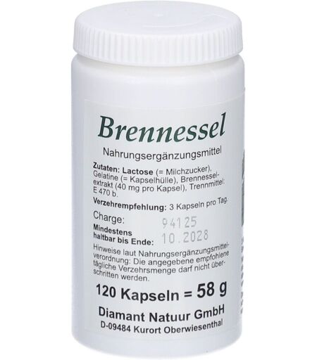 Nahrungsergänzungsmittel sind kein Ersatz für eine ausgewogene und abwechslungsreiche Ernährung und eine gesunde Lebensweise.BrennesselNahrungsergänzungsmittel mit BrennesselextraktZutaten:Lactose (=Milchzucker), Gelantine (=Kapselhülle), Brennesselextrakt, E 470 bNährwerte: Durchschnittliche Nährwerte: pro Kapsel Brennesselextrakt 40 mg Verzehrempfehlung:Nehmen Sie 1x täglich 3 Kapsel mit ausreichend Flüssigkeit ein.Hinweis: Die angegebene empfohlene tägliche Verzehrmenge darf nicht überschritten werden.Aufbewahrung:Kühl (6-25 °C) und lichtgeschützt lagern. Außerhalb der Reichweite von kleinen Kindern aufbewahren.Nettofüllmenge:120 Kapseln = 58 gHersteller: FBK Pharma GmbH D-09484 Kurort Oberwiesenthal ...