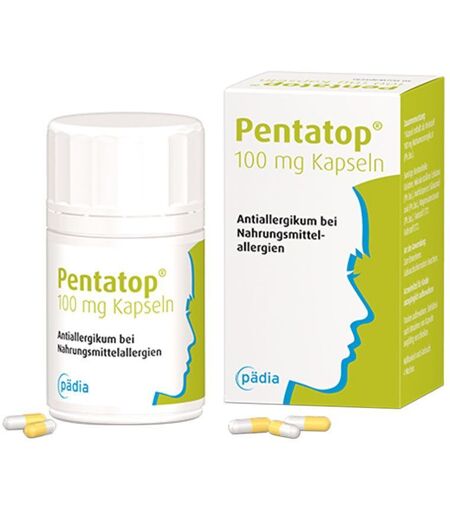 PENTATOP® 100mg Kapseln ist ein Antiallergikum und gehört zur Gruppe der Mastzellstabilisatoren. Nach oraler Applikation stabilisiert es die Mastzellen der Schleimhäute und blockiert somit die Ausschüttung von allergieauslösenden Mediatoren (z.B. Histamin). Einige Fakten zu PENTATOP® 100mg Kapseln: reduzieren die Symptome einer Nahrungsmittelallergie werden für Erwachsene, Kinder und Säuglinge empfohlen sind unkompliziert in der Anwendung sind 15 – 30 Minuten vor den Mahlzeiten einzunehmen. Kapseln können entweder mit etwas Wasser geschluckt werden oder – bei Nahrungsmittelallergie besonders empfehlenswert – Kapselninhalt in 2 – 3 Esslöffeln heißem Wasser lösen sollten, um eine optimale Wirkung zu erzielen, viermal täglich eingenommen werden enthalten den Wirkstoff Natriumcromoglicat und wirken entzündungshemmend sowie antiallergisch können auch von Diabetikern eingenommen werden sollten zur Behandlung einer Nahrungsmittelallergie immer in Absprache mit dem behandelnden Arzt erfolgen sind ein Arzneimittel und nur in Apotheken erhältlich sind gluten- und laktosefrei sind durch die einfache Handhabung optimal auf Reisen und für Berufstätige Wirkstoff:Natriumcromoglicat (Ph. Eur.) Zusammensetzung:1 Kapsel enthält als Wirkstoff 100mg Natriumcromoglicat (Ph. Eur.) Sonstige Bestandteile:Gelatine (Ph. Eur.), hochdisperses Siliciumdioxid, Farbstoff E171 Anwendungsgebiet:PENTATOP® 100mg Kapseln wird angewendet bei Nahrungsmittelallergien, die nicht durch den Verzicht auf das auslösende Nahrungsmittel behandelbar sind. Gegenanzeigen:PENTATOP® 100mg Kapseln darf nicht verabreicht werden bei Patienten mit bekannter Überempfindlichkeit gegenüber Natriumcromoglicat (Ph. Eur.) oder einem der sonstigen Bestandteile des Arzneimittels. Der Einsatz von PENTATOP® 100mg Kapseln kann bei Säuglingen in den ersten beiden Lebensmonaten (bei Frühgeborenen entsprechend länger) zurzeit noch nicht empfohlen werden. Nebenwirkungen:Generalisierte Störungen/Immunsystem: Beobachtet wurden (sehr selten) Überempfindlichkeitsreaktionen mit Hautausschlag, Juckreiz, Haut- und Schleimhautschwellung, Nesselsucht sowie (sehr selten) schwere generalisierte anaphylaktische Reaktionen mit verengten Atemwegen (Bronchospasmus, Larynxödem). Muskel- und Skelettsystem: Gelenkschmerzen (sehr selten) Pflichtangaben: Pentatop 200 mg Granulat/Pentatop 100 mg Kapseln. Natriumcromoglicat. Nahrungsmittelallergien, bei denen eine Allergenkarenz nicht möglich ist. Dieses Arzneimittel enthält Sucrose. Bitte nehmen Sie Pentatop 200 mg Granulat erst nach Rücksprache mit Ihrem Arzt ein, wenn Ihnen bekannt ist, dass Sie unter einer Unverträglichkeit gegenüber bestimmten Zuckern leiden. Zu Risiken und Nebenwirkungen lesen Sie die Packungsbeilage und fragen Sie Ihren Arzt oder Apotheker. ...
