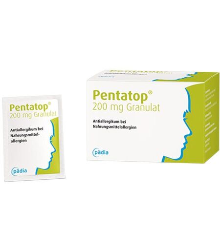PENTATOP® 200mg Granulat ist ein Antiallergikum und gehört zur Gruppe der Mastzellstabilisatoren. Nach oraler Applikation stabilisiert es die Mastzellen der Schleimhäute und blockiert somit die Ausschüttung von allergieauslösenden Mediatoren (z.B. Histamin).Einige Fakten zu PENTATOP® 200mg Granulat: PENTATOP® 200mg Granulat reduziert die Symptome einer Nahrungsmittelallergie wird für Jugendliche ab 15 Jahren und Erwachsene empfohlen ist ein leicht lösliches Granulat und daher unkompliziert in der Anwendung Granulat ist 15 – 30 Minuten vor den Mahlzeiten in wenig Wasser aufzulösen und zu trinken. Es empfiehlt sich, die Lösung mehrmals vor dem Schlucken im Mund zu spülen ist gluten- und laktosefrei sollte, um eine optimale Wirkung zu erzielen, viermal täglich eingenommen werden enthält den Wirkstoff Natriumcromoglicat und wirkt entzündungshemmend sowie antiallergisch kann auch von Diabetikern eingenommen werden. Die enthaltene Succrose entspricht 0,16 Broteinheiten (BE). sollte zur Behandlung einer Nahrungsmittelallergie immer in Absprache mit dem behandelnden Arzt erfolgen ist ein Arzneimittel und nur in Apotheken erhältlichWirkstoff:Natriumcromoglicat (Ph. Eur.)Zusammensetzung:1 Beutel enthält als Wirkstoff 200mg Natriumcromoglicat (Ph. Eur.)Sonstige Bestandteile:1760mg Sucrose (Zucker) (Ph. Eur.) entspricht 0,16 BEAnwendungsgebiet:PENTATOP® 200mg Granulat wird angewendet bei Nahrungsmittelallergien, die nicht durch den Verzicht auf das auslösende Nahrungsmittel behandelbar sind.Gegenanzeigen:PENTATOP® 200 mg Granulat darf nicht verabreicht werden bei Patienten mit bekannter Überempfindlichkeit gegenüber Natriumcromoglicat (Ph.Eur.) oder einem der sonstigen Bestandteile.Der Einsatz von PENTATOP® 200 mg Granulat kann bei Säuglingen in den ersten beiden Lebensmonaten (bei Frühgeborenen entsprechend länger) zurzeit noch nicht empfohlen werden.Nebenwirkungen:Generalisierte Störungen/Immunsystem: Beobachtet wurden (sehr selten) Überempfindlichkeitsreaktionen mit Hautausschlag, Juckreiz, Haut- und Schleimhautschwellung, Nesselsucht sowie (sehr selten) schwere generalisierte anaphylaktische Reaktionen mit verengten Atemwegen (Bronchospasmus, Larynxödem).Muskel- und Skelettsystem: Gelenkschmerzen (sehr selten)Enthält Sucrose (Zucker). Gebrauchsinformation beachten! Pflichtangaben: Pentatop 200 mg Granulat/Pentatop 100 mg Kapseln. Natriumcromoglicat. Nahrungsmittelallergien, bei denen eine Allergenkarenz nicht möglich ist. Dieses Arzneimittel enthält Sucrose. Bitte nehmen Sie Pentatop 200 mg Granulat erst nach Rücksprache mit Ihrem Arzt ein, wenn Ihnen bekannt ist, dass Sie unter einer Unverträglichkeit gegenüber bestimmten Zuckern leiden. Zu Risiken und Nebenwirkungen lesen Sie die Packungsbeilage und fragen Sie Ihren Arzt oder Apotheker. ...