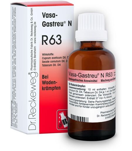 Was ist Vasa-Gastreu® N R 63 und wofür wird es angewendet?Vasa-Gastreu® N R 63 ist ein homöopathisches Arzneimittel bei Erkrankungen des Gefäßsystems und des Bewegungsapparates. Anwendungsgebiete: Die Anwendungsgebiete leiten sich von den homöopathischen Arzneimittelbildern ab. Dazu gehören: Zur Besserung von Wadenkrämpfen. Wie ist Vasa-Gastreu® N R 63 anzuwenden? Nehmen Sie Vasa-Gastreu® N R 63 immer genau nach der Anweisung in dieser Packungsbeilage ein. Bitte fragen Sie bei Ihrem Arzt oder Apotheker nach, wenn Sie sich nicht ganz sicher sind. Soweit nicht anders verordnet: Bei akuten Zuständen alle halbe bis ganze Stunde, höchstens 6-mal täglich, je 5 Tropfen einnehmen. Eine über 1 Woche hinausgehende Anwendung sollte nur nach Rücksprache mit einem homöopathisch erfahrenen Therapeuten erfolgen. Bei chronischen Verlaufsformen 1- bis 3-mal täglich je 5 Tropfen einnehmen. Bei Besserung der Beschwerden ist die Häufigkeit der Anwendung zu reduzieren. Dauer der Anwendung: Auch homöopathische Arzneimittel sollten ohne ärztlichen Rat nicht über längere Zeit eingenommen werden. Wenn Sie weitere Fragen zur Anwendung des Arzneimittels haben, fragen Sie Ihren Arzt oder Apotheker. Das Arzneimittel Vasa-Gastreu® N R 63 enthält:10 ml enthalten: Wirkstoffe: Cuprum aceticum Dil. D6, Secale cornutum Dil. D4, Tabacum Dil. D4 je 1 ml. Die Wirkstoffe 2 bis 3 werden über die vorletzte Stufe gemeinsam potenziert. Die Wirkstoffe 1 bis 3 werden über die letzte Stufe gemeinsam potenziert. Sonstiger Bestandteil: Ethanol 30% (m/m). 1 ml entspricht 20 Tropfen. ...