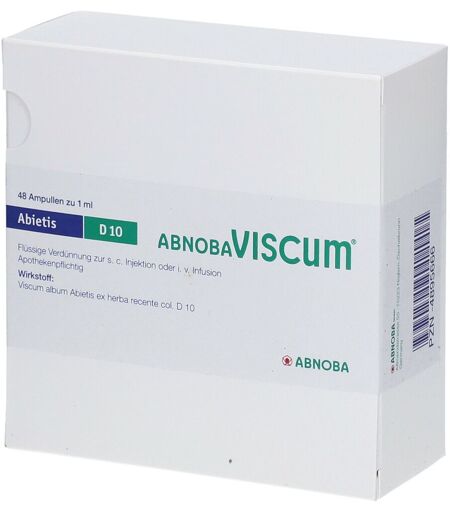 Wirkstoff:Jede Ampulle enthält 1 ml Viscum album Abietis ex herba recente col. D10Was ist abnoba VISCUM Und Wofür Wird es angewendet?abnobaVISCUM ist ein anthroposophisches Arzneimittel zur erweiterten Behandlung bei Geschwulstkrankheiten.Anwendungsgebiete:Gemäß der anthroposophischen Menschen- und Naturerkenntnis wird abnoba-VISCUM angewendet, um bei Erwachsenen die Form- und Integrationskräfte zur Auflösung und Wiedereingliederung verselbständigter Wachstumsprozesse anzuregen, z.B.bei bösartigen Geschwulstkrankheiten, auch mit begleitenden Störungen der blutbildenden Organebei gutartigen Geschwulstkrankheitenzur Vorbeugung gegen Rückfälle (Rezidivprophylaxe) nach Geschwulstoperationenbei Vorstufen bestimmter Krebserkrankungen (definierte Präkanzerosen). Wie ist abnobaViSCUM anzuwenden?Art der Anwendung:Die subkutane Injektion sollte nach Möglichkeit in Tumor - bzw. Metastasennähe, ansonsten an stets wechselnden Körperstellen (unterschiedliche Stellen im Bauchbereich, ggf. Oberschenkel oder Oberarm) erfolgen.Nicht in entzündete Hautbereiche oder Bestrahlungsfelder injizieren. Es ist auf streng subkutane Injektionstechnik zu achten.Vorsichtshalber wird empfohlen, abnobaVISCUM nicht mit anderen Arzneimitteln in einer Spritze aufzuziehen.Nach Säuberung der Einstichstelle (z.B. durch Abreiben mit 70%igem Alkohol) eine Hautfalte bilden und die Injektionsnadel schräg einstechen. Den Spritzenstempel leicht zurückziehen. Sollte Blut erscheinen, wurde ein Blutgefäß getroffen.Die Injektion in diesem Fall an einer anderen Stelle wiederholen. Wenn kein Blut erscheint, langsam injizieren, anschließend die Nadel herausziehen und auf die Einstichstelle kurz mit einem Tupfer drücken.Es wird in jedem Fall empfohlen, die Injektionstechnik durch eine darin erfahrene Person zu erlernen.Ampullen sind unmittelbar nach dem Öffnen zu injizieren. Angebrochene Ampullen dürfen nicht mehr für eine spätere Injektion verwendet werden.Nur die Potenzstufen D 10, D 20 und D 30:Für die Potenzstufen D 10, D 20 und D 30 kann in besonderen Fällen die erforderliche Dosis einer Infusionslösung zugemischt (physiologische Kochsalzlösung oder 5%-ige Glukoselösung) und langsam intravenös infundiert werden. Die Infusionsdauer sollte für 250 ml mindestens 90 min. dauern.Dosierung und Häufigkeit der AnwendungRichten sich nach der jeweiligen körperlichen Verfassung und werden individuell von Ihrem Arzt festgelegt.Dosierung und Häufigkeit der Anwendung:Einleitungsphase:Soweit nicht anders angegeben, erfolgt die Dosierung stets mit 1 ml der Injektionslösung der angegebenen Stärke bzw. Potenzstufe. Sie sollten die Behandlung mit der Stärke 0,02 mg dreimal wöchentlich beginnen (für die Stärken 0,02 mg, 0,2 mg, 2 mg, 20 mg und Potenzstufe D 6) und dann solange vorsichtig mit den nächst höheren Dosen stufenweise weiterführen, bis Sie die optimale Dosis erreicht haben.Die Dosierung erfolgt grundsätzlich individuell nach Anweisung des Arztes und richtet sich nach Ihrer Reaktionslage.Die... ...