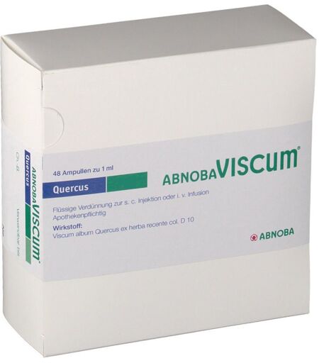 Wirkstoff:Jede Ampulle enthält 1 ml Viscum album Quercus ex herba recente col. Dil. D20Was ist abnoba VISCUM Und Wofür Wird es angewendet?abnobaVISCUM ist ein anthroposophisches Arzneimittel zur erweiterten Behandlung bei Geschwulstkrankheiten.Anwendungsgebiete:Gemäß der anthroposophischen Menschen- und Naturerkenntnis wird abnoba-VISCUM angewendet, um bei Erwachsenen die Form- und Integrationskräfte zur Auflösung und Wiedereingliederung verselbständigter Wachstumsprozesse anzuregen, z.B.bei bösartigen Geschwulstkrankheiten, auch mit begleitenden Störungen der blutbildenden Organebei gutartigen Geschwulstkrankheitenzur Vorbeugung gegen Rückfälle (Rezidivprophylaxe) nach Geschwulstoperationenbei Vorstufen bestimmter Krebserkrankungen (definierte Präkanzerosen). Wie ist abnobaViSCUM anzuwenden?Art der Anwendung:Die subkutane Injektion sollte nach Möglichkeit in Tumor - bzw. Metastasennähe, ansonsten an stets wechselnden Körperstellen (unterschiedliche Stellen im Bauchbereich, ggf. Oberschenkel oder Oberarm) erfolgen.Nicht in entzündete Hautbereiche oder Bestrahlungsfelder injizieren. Es ist auf streng subkutane Injektionstechnik zu achten.Vorsichtshalber wird empfohlen, abnobaVISCUM nicht mit anderen Arzneimitteln in einer Spritze aufzuziehen.Nach Säuberung der Einstichstelle (z.B. durch Abreiben mit 70%igem Alkohol) eine Hautfalte bilden und die Injektionsnadel schräg einstechen. Den Spritzenstempel leicht zurückziehen. Sollte Blut erscheinen, wurde ein Blutgefäß getroffen.Die Injektion in diesem Fall an einer anderen Stelle wiederholen. Wenn kein Blut erscheint, langsam injizieren, anschließend die Nadel herausziehen und auf die Einstichstelle kurz mit einem Tupfer drücken.Es wird in jedem Fall empfohlen, die Injektionstechnik durch eine darin erfahrene Person zu erlernen.Ampullen sind unmittelbar nach dem Öffnen zu injizieren. Angebrochene Ampullen dürfen nicht mehr für eine spätere Injektion verwendet werden.Nur die Potenzstufen D 10, D 20 und D 30:Für die Potenzstufen D 10, D 20 und D 30 kann in besonderen Fällen die erforderliche Dosis einer Infusionslösung zugemischt (physiologische Kochsalzlösung oder 5%-ige Glukoselösung) und langsam intravenös infundiert werden. Die Infusionsdauer sollte für 250 ml mindestens 90 min. dauern.Dosierung und Häufigkeit der AnwendungRichten sich nach der jeweiligen körperlichen Verfassung und werden individuell von Ihrem Arzt festgelegt.Dosierung und Häufigkeit der Anwendung:Einleitungsphase:Soweit nicht anders angegeben, erfolgt die Dosierung stets mit 1 ml der Injektionslösung der angegebenen Stärke bzw. Potenzstufe. Sie sollten die Behandlung mit der Stärke 0,02 mg dreimal wöchentlich beginnen (für die Stärken 0,02 mg, 0,2 mg, 2 mg, 20 mg und Potenzstufe D 6) und dann solange vorsichtig mit den nächst höheren Dosen stufenweise weiterführen, bis Sie die optimale Dosis erreicht haben.Die Dosierung erfolgt grundsätzlich individuell nach Anweisung des Arztes und richtet sich nach Ihrer... ...