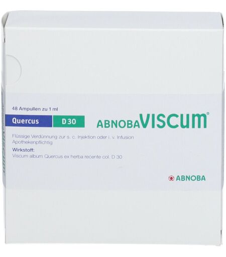 Wirkstoff:Jede Ampulle enthält 1 ml Viscum album Quercus ex herba recente col. Dil. D30Was ist abnoba VISCUM Und Wofür Wird es angewendet?abnobaVISCUM ist ein anthroposophisches Arzneimittel zur erweiterten Behandlung bei Geschwulstkrankheiten.Anwendungsgebiete:Gemäß der anthroposophischen Menschen- und Naturerkenntnis wird abnoba-VISCUM angewendet, um bei Erwachsenen die Form- und Integrationskräfte zur Auflösung und Wiedereingliederung verselbständigter Wachstumsprozesse anzuregen, z.B.bei bösartigen Geschwulstkrankheiten, auch mit begleitenden Störungen der blutbildenden Organebei gutartigen Geschwulstkrankheitenzur Vorbeugung gegen Rückfälle (Rezidivprophylaxe) nach Geschwulstoperationenbei Vorstufen bestimmter Krebserkrankungen (definierte Präkanzerosen). Wie ist abnobaViSCUM anzuwenden?Art der Anwendung:Die subkutane Injektion sollte nach Möglichkeit in Tumor - bzw. Metastasennähe, ansonsten an stets wechselnden Körperstellen (unterschiedliche Stellen im Bauchbereich, ggf. Oberschenkel oder Oberarm) erfolgen.Nicht in entzündete Hautbereiche oder Bestrahlungsfelder injizieren. Es ist auf streng subkutane Injektionstechnik zu achten.Vorsichtshalber wird empfohlen, abnobaVISCUM nicht mit anderen Arzneimitteln in einer Spritze aufzuziehen.Nach Säuberung der Einstichstelle (z.B. durch Abreiben mit 70%igem Alkohol) eine Hautfalte bilden und die Injektionsnadel schräg einstechen. Den Spritzenstempel leicht zurückziehen. Sollte Blut erscheinen, wurde ein Blutgefäß getroffen.Die Injektion in diesem Fall an einer anderen Stelle wiederholen. Wenn kein Blut erscheint, langsam injizieren, anschließend die Nadel herausziehen und auf die Einstichstelle kurz mit einem Tupfer drücken.Es wird in jedem Fall empfohlen, die Injektionstechnik durch eine darin erfahrene Person zu erlernen.Ampullen sind unmittelbar nach dem Öffnen zu injizieren. Angebrochene Ampullen dürfen nicht mehr für eine spätere Injektion verwendet werden.Nur die Potenzstufen D 10, D 20 und D 30:Für die Potenzstufen D 10, D 20 und D 30 kann in besonderen Fällen die erforderliche Dosis einer Infusionslösung zugemischt (physiologische Kochsalzlösung oder 5%-ige Glukoselösung) und langsam intravenös infundiert werden. Die Infusionsdauer sollte für 250 ml mindestens 90 min. dauern.Dosierung und Häufigkeit der AnwendungRichten sich nach der jeweiligen körperlichen Verfassung und werden individuell von Ihrem Arzt festgelegt.Dosierung und Häufigkeit der Anwendung:Einleitungsphase:Soweit nicht anders angegeben, erfolgt die Dosierung stets mit 1 ml der Injektionslösung der angegebenen Stärke bzw. Potenzstufe. Sie sollten die Behandlung mit der Stärke 0,02 mg dreimal wöchentlich beginnen (für die Stärken 0,02 mg, 0,2 mg, 2 mg, 20 mg und Potenzstufe D 6) und dann solange vorsichtig mit den nächst höheren Dosen stufenweise weiterführen, bis Sie die optimale Dosis erreicht haben.Die Dosierung erfolgt grundsätzlich individuell nach Anweisung des Arztes und richtet sich nach Ihrer... ...