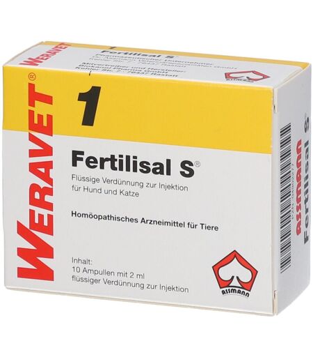 Weravet® 1 Fertilisal S Homöopathisches Arzneimittel zur Injektion für Hunde und Katzen. Die Anwendungsgebiete entsprechen dem veterinärhomöopathischen Arzneimittelbild. Dazu gehören Sterilitätsbehandlung bei Hund und Katze, Azyklie, mangelhafte Fruchtbarkeit bei Hunden, ungenügend ausgeprägte Brunsterscheinungen. Anwendung: Zum Eingeben mit dem Futter oder über das Trinkwasser. Zusammensetzung: 1 Ampulle zu 2 ml (2010,1 mg) enthält: Wirkstoffe: Aristolochia clematis Dil. C30 199,1 mg, Cimicifuga racemosa Dil. C30 199,1 mg, Pulsatilla pratensis Dil. C30 199,1 mg. Sonstige Bestandteile: Natriumchlorid, Wasser für Injektionszwecke. ...