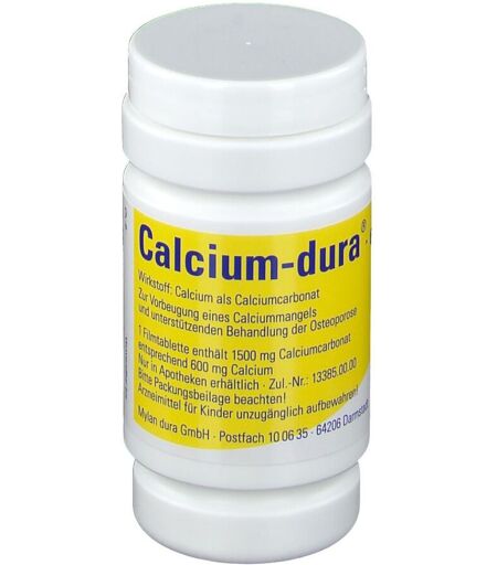 Wirkstoff:CalciumcarbonatAnwendungsgebiete: Zur Vorbeugung eines Calciummangels bei erhöhtem Bedarf (z. B. Wachstumsalter, Schwangerschaft, Stillzeit). Zur unterstützenden Behandlung der Osteoporose.Stand: Januar 2008Hersteller:Mylan dura GmbH, Postfach 10 06 35, 64206 Darmstadt Zu Risiken und Nebenwirkungen lesen Sie die Packungsbeilage und fragen Sie Ihren Arzt oder Apotheker. ...