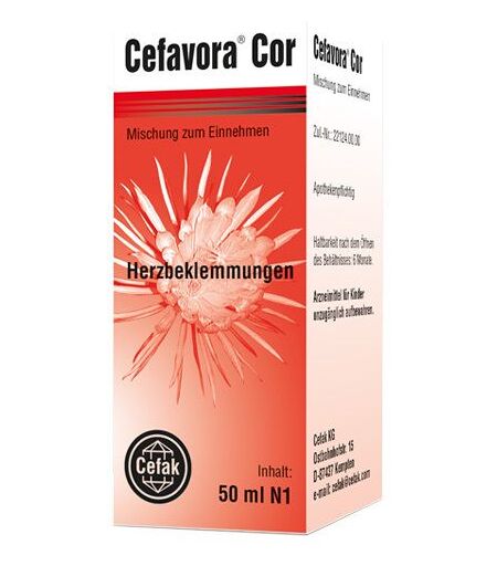 Was ist Cefavora® Cor und wofür wird es angewendet?Cefavora® Cor ist ein homöopathisches Arzneimittel bei Erkrankungen des Herz-Kreislaufsystems Anwendungsgebiete:Die Anwendungsgebiete entsprechen dem homöopathischen Arzneimittelbild. Dazu gehören: Pectanginöse Beschwerden (Beklemmungsgefühl in der Herzgegend).Hinweis: Bei akuten Beschwerden empfehlen wir die Rücksprache mit dem Arzt.Wie ist Cefavora® Cor einzunehmen?Nehmen Sie Cefavora® Cor immer genau wie in dieser Packungsbeilage beschrieben bzw. genau nach der mit Ihrem Arzt oder Apotheker getroffenen Absprache ein. Fragen Sie bei Ihrem Arzt oder Apotheker nach, wenn Sie sich nicht sicher sind. Die empfohlene Dosis beträgt: Erwachsene und Jugendliche ab 12 Jahren: 3 – 4-mal täglich 20 – 30 Tropfen.Art der Anwendung:Cefavora® Cor kann unverdünnt oder mit 5 bis 15 ml Wasser verdünnt eingenommen werden.Dauer der Anwendung:Auch homöopathische Medikamente sollten ohne ärztlichen Rat nicht über längere Zeit angewendet werden.Bitte sprechen Sie mit Ihrem Arzt oder Apotheker, wenn Sie den Eindruck haben, dass die Wirkungdieses Arzneimittels zu stark oder zu schwach ist. ...