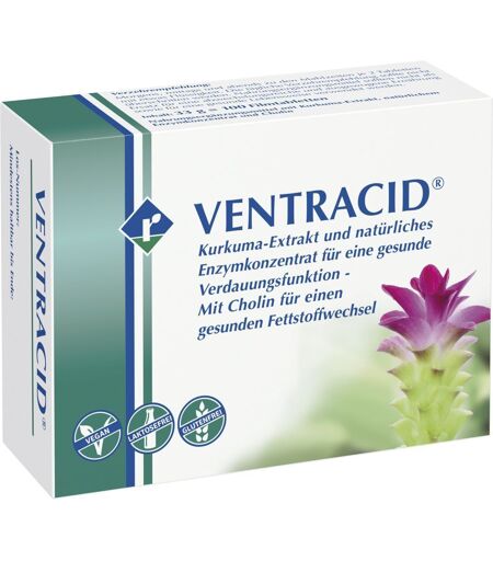 Nahrungsergänzungsmittel sind kein Ersatz für eine ausgewogene und abwechslungsreiche Ernährung und eine gesunde Lebensweise. VENTRACID - Für eine gesunde Verdauungsfunktionpflanzliche Enzyme verbessern die Fettverdauung Indische Kurkuma bringt Leber und Galle in Schwung Natriumhydrogencarbonat puffert überschüssige Säure ab Natürlich, wirksam und sicher!Zutaten:Füllstoffe (Isomalt, Cellulose), Cholinbitartrat (10 %), Kurkuma-Extrakt (6 %), Überzugsmittel (Hydroxypropylmethylcellulose), pflanzliches Enzymkonzentrat (3 %), Trennmittel (Talkum), Überzugsmittel (Speisefettsäuren, Calciumcarbonat, Magnesiumsalze der pflanzlichen Speisefettsäuren), Trennmittel (Siliciumdioxid), Farbstoffe (Eisenoxide und Eisenhydroxide), Überzugsmittel (Polyethylenglycol)Nährwerte:Stoffe mit ernährungsspezifischer oder physiologischer WirkungMenge pro empfohlene tägliche Verzehrmenge von 6 TablettenNatriumhydrogencarbonat780 mgEnzymkonzentrat60 mgKurkuma-Extrakt120 mg Verzehrempfehlung:Morgens, mittags und abends zu den Mahlzeiten je 2 Tabletten mit etwas Flüssigkeit.Hinweis:Die angegebene empfohlene tägliche Verzehrmenge darf nicht überschritten werden.Aufbewahrung: Kühl (6-25 °C) und lichtgeschützt lagern. Außerhalb der Reichweite von Kindern aufbewahren.Nettofüllmenge: 100 Tabletten = 33 gHersteller: Repha GmbH Biologische Arzneimittel Alt-Godshorn 8730855 Langenhagen ...
