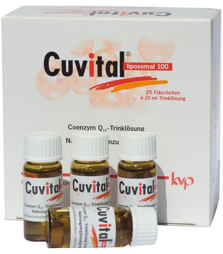 Nahrungsergänzungsmittel sind kein Ersatz für eine ausgewogene und abwechslungsreiche Ernährung und eine gesunde Lebensweise.Eigenschaften:CuvitalTrinkkonzentrat ist ein trinkfähiges und ausgewogenes Vitalstoffpaket, insbesondere für Menschen, die Belastungen ausgesetzt sind.Dazu gehörenErwachsene bei hohem beruflichen und privaten Stress Zur Stärkung der körpereigenen Selbstheilungskräfte Junggebliebene Menschen als Anti-Aging“ Kinder im Wachstum Hochleistungs- und Freizeitsportler zum Schutz vor Überforderung Begleitend zur naturheilkundlichen Therapie und zur Schulmedizin.Verzehrempfehlung:Einmal täglich den Inhalt eines halben (5 ml bzw. 50 mg Coenzym Q10) bzw. ganzen (10 ml bzw. 100 mg Coenzym Q10) Fläschchens unverdünnt oder verdünnt mit einem Glas Wasser trinken.Coenzym Q10 ist maßgeblich an Prozessen der Energiebereitstellung in den Mitochondrien (den Kraftwerken“ der Zelle) in Form des Adenosintriphosphates (ATP) beteiligt. Stark beanspruchte Organe, mit hohem Energieverbrauch (Herz, Niere, Leber, Muskeln, Bauchspeicheldrüse), weisen die höchsten Q10-Werte auf.Cuvital liposomal 100ist das Cuvital-Präparat der Wahl, wenn gewünscht wird, Coenzym Q10 in einer verhältnismäßig hohen Zufuhrmenge bzw. verbesserten Verfügbarkeit für den Körper einzusetzen. Durch ein spezielles Herstellungsverfahren wird das normalerweise wasserunlösliche Coenzym Q10 in eine wasserlösliche Form überführt. Dadurch wird die Q10-Aufnahme im Magen-Darm-Trakt erleichtert und somit eine höhere Verwertbarkeit von Q10 für den Organismus herbeigeführt. Das liposomale“ Coenzym Q10“ wird auch als flüssiges Coenzym Q10“ oder wasserlösliches Coenzym Q10“ bezeichnet.Zusammensetzung: Pro Fläschchen (10 ml) Coenzym Q10 100 mg Zutaten:Gereinigtes Wasser(Lösungsmittel), Glycerin (Trägerstoff), Coenzym Q10, Pflanzliches Öl, Sojalecithin (Emulgator), wasserfreie Citronensäure (Säuerungsmittel). Natriumcyclamat, Süßstoff, Kaliumsorbat, Konservierungsstoff) Aroma Orange, Saccharin, Natrium (Süßstoff)Cuvital® liposomal 100 ist glutenfrei, frei von Alkohol, Fruktose, Lactose und FarbstoffenNettofüllmenge:25x10 ml FlüssigkeitHerstellerdaten:Köhler Pharma GmbH Neue Bergstraße 3 - 764665 Alsbach-Hähnlein ...