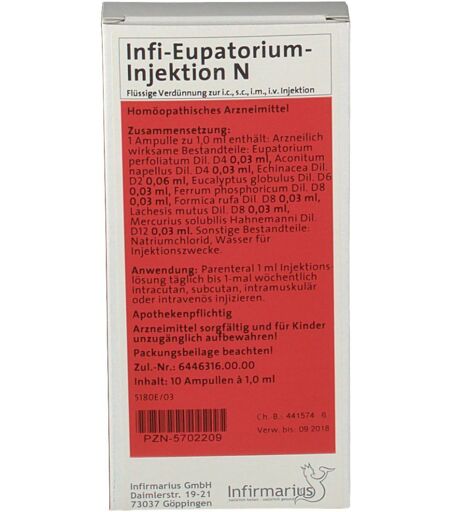 Homöopathisches Arzneimittel bei Erkältungskrankheiten.Zusammensetzung:1 Ampulle zu 1,0 ml enthält (arzneilich wirksame Bestandteile):Eupatorium perfoliatum Dil. D4 0,03 mlAconitum napellus Dil. D4 0,03 mlEchinacea Dil. D2 0,06 mlEucalyptus globulus Dil. D6 0,03 mlFerrum phosphoricum Dil. D8 0,03 mlFormica rufa Dil. D8 0,03 mlLachesis mutus Dil. D8 0,03 mlMercurius solubilis Hahnemanni Dil. D12 0,03 mlSonstige Bestandteile:Natriumchlorid, Wasser für Injektionszwecke.Gegenanzeigen:Gegenanzeigen sind Krankheiten oder Umstände, bei denen bestimmte Arzneimittel nicht oder nur nach sorgfältiger Prüfung durch den Arzt oder Heilpraktiker angewendet werden dürfen.Wann dürfen Sie Infi-Eupatorium-Injektion N nicht anwenden?Infi-Eupatorium-Injektion N darf nicht bei Überempfindlichkeit gegen einen der Wirkstoffe, z.B. Echinacea (Sonnenhut), oder gegen Korbblütler angewendet werden. Nicht anwenden bei Diabetes mellitus.Aus grundsätzlichen Überlegungen darf Infi-Eupatorium-Injektion N nicht angewendet werden bei fortschreitenden Systemerkrankungen wie Tuberkulose, Leukämie bzw. leukämieähnlichen Erkrankungen (Leukosen), entzündlichen Erkrankungen des Bindegewebes (Kollagenosen), Autoimmunerkrankungen, multipler Sklerose, AIDS-Erkrankung, HIV-Infektion oder anderen chronischen Viruserkrankungen.Was müssen Sie in der Schwangerschaft und Stillzeit beachten?Da keine ausreichend dokumentierten Erfahrungen vorliegen, sollte Infi-Eupatorium-Injektion N in der Schwangerschaft und Stillzeit nur nach Rücksprache mit dem Arzt angewendet werden.Wechselwirkungen:Für Infi-Eupatorium-Injektion N sind keine Wechselwirkungen bekannt.Allgemeiner Hinweis:Die Wirkung eines homöopathischen Arzneimittels kann durch allgemein schädigende Faktoren in der Lebensweise und durch Reiz- und Genussmittel ungünstig beeinflusst werden. Falls Sie sonstige Arzneimittel einnehmen, fragen Sie Ihren Arzt.Warnhinweise:Was ist bei Kindern zu berücksichtigen?Zur Anwendung dieses Arzneimittels bei Kindern liegen keine ausreichend dokumentierten Erfahrungen vor. Es soll deshalb bei Kindern unter 12 nicht angewendet werden.Dosierungsanleitung, Art und Dauer der Anwendung:Soweit nicht anders verordnet:Parenteral 1 ml Injektionslösung täglich bis 1-mal wöchentlich intracutan, subcutan, intramuskulär oder intravenös injizieren.Infi-Eupatorium-Injektion N sollte ohne ärztlichen Rat nicht länger als 3 Wochen angewendet werden.Nebenwirkungen:Arzneimittel können neben den erwünschten Hauptwirkungen auch unerwünschte Wirkungen, sogenannte Nebenwirkungen, haben.In Einzelfällen können Überempfindlichkeitsreaktionen auftreten.Für Arzneimittel mit Zubereitungen aus Sonnenhut (Echinacea) wurden Hautausschlag, Juckreiz, selten Gesichtsschwellung, Atemnot, Schwindel und Blutdruckabfall beobachtet. In diesen Fällen ist das Arzneimittel abzusetzen und ein Arzt aufzusuchen.Nach Anwendung kann außerdem verstärkt Speichelfluss auftreten, das Mittel ist dann ebenfalls abzusetzen.Hinweis: Bei der Anwendung eines... ...