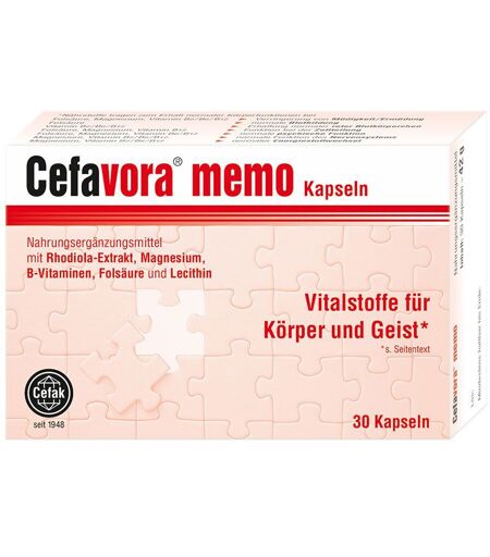 Nahrungsergänzungsmittel sind kein Ersatz für eine ausgewogene und abwechslungsreiche Ernährung und eine gesunde Lebensweise. Cefavora® memo Nahrungsergänzungsmittel mit Rhodiola-Extrakt, Magnesium, B-Vitaminen, Folsäure und Lecithin. Zutaten: Pflanzliches Öl (Soja), Lecithin (Soja) (21 %), Gelatine, Rhodiola rosea Extrakt* (14 %), Magnesiumoxid, Feuchthaltemittel Glycerin, DL-α-Tocopherylacetat, Pyridoxinhydrochlorid, Farbstoff Eisenoxide und Eisenhydroxide, Riboflavin, Pteroylmonoglutaminsäure, Cyanocobalamin. *mindestens 3 % Rosavine Glutenfrei. Ohne Zusatz von: Aroma, Fructose, Hefe, Lactose, Süßungsmittel, Zucker. ZusammensetzungTagesdosis1 Kapsel% der empfohlenen Tagesdosis(NRV)Magnesium100 mg27 %Riboflavin (Vitamin B2)4,5 mg321 %Vitamin B65 mg357 %Vitamin B129 µg360 %Vitamin E (RRR-α-TE)10 mg83 %Folsäure400 µg200 %Rhodiola rosea Extrakt200 mg**Lecithin300 mg** NRV = nutrient reference value = Nährstoffbezugswert nach LMIV; **keine NRV-Vorgabe Verzehrsempfehlung: 1 Kapsel täglich mit ausreichend Flüssigkeit (z.B. Wasser) morgens einnehmen. Hinweis: Die angegebene empfohlene Tagesmenge darf nicht überschritten werden. Für Schwangere, Stillende und Kinder unter 12 Jahren liegen keine Erfahrungswerte zu Rhodiola vor. Aufbewahrung: Kühl (6-25 °C) und lichtgeschützt lagern. Außerhalb der Reichweite von kleinen Kindern aufbewahren. Inhalt: 30 Kapseln = 42 g Herstellerdaten: Cefak KG Ostbahnhofstr. 15 D-87437 Kempten. ...