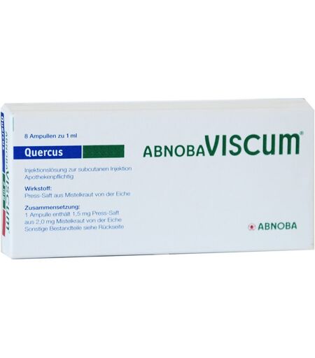 Wirkstoff:Jede Ampulle enthält 1 ml Auszug aus frischem Eichenmistel.Was ist abnoba VISCUM Und Wofür Wird es angewendet?abnobaVISCUM ist ein anthroposophisches Arzneimittel zur erweiterten Behandlung bei Geschwulstkrankheiten.Anwendungsgebiete:Gemäß der anthroposophischen Menschen- und Naturerkenntnis wird abnoba-VISCUM angewendet, um bei Erwachsenen die Form- und Integrationskräfte zur Auflösung und Wiedereingliederung verselbständigter Wachstumsprozesse anzuregen, z.B.bei bösartigen Geschwulstkrankheiten, auch mit begleitenden Störungen der blutbildenden Organebei gutartigen Geschwulstkrankheitenzur Vorbeugung gegen Rückfälle (Rezidivprophylaxe) nach Geschwulstoperationenbei Vorstufen bestimmter Krebserkrankungen (definierte Präkanzerosen). Wie ist abnobaViSCUM anzuwenden?Art der Anwendung:Die subkutane Injektion sollte nach Möglichkeit in Tumor - bzw. Metastasennähe, ansonsten an stets wechselnden Körperstellen (unterschiedliche Stellen im Bauchbereich, ggf. Oberschenkel oder Oberarm) erfolgen.Nicht in entzündete Hautbereiche oder Bestrahlungsfelder injizieren. Es ist auf streng subkutane Injektionstechnik zu achten.Vorsichtshalber wird empfohlen, abnobaVISCUM nicht mit anderen Arzneimitteln in einer Spritze aufzuziehen.Nach Säuberung der Einstichstelle (z.B. durch Abreiben mit 70%igem Alkohol) eine Hautfalte bilden und die Injektionsnadel schräg einstechen. Den Spritzenstempel leicht zurückziehen. Sollte Blut erscheinen, wurde ein Blutgefäß getroffen.Die Injektion in diesem Fall an einer anderen Stelle wiederholen. Wenn kein Blut erscheint, langsam injizieren, anschließend die Nadel herausziehen und auf die Einstichstelle kurz mit einem Tupfer drücken.Es wird in jedem Fall empfohlen, die Injektionstechnik durch eine darin erfahrene Person zu erlernen.Ampullen sind unmittelbar nach dem Öffnen zu injizieren. Angebrochene Ampullen dürfen nicht mehr für eine spätere Injektion verwendet werden.Nur die Potenzstufen D 10, D 20 und D 30:Für die Potenzstufen D 10, D 20 und D 30 kann in besonderen Fällen die erforderliche Dosis einer Infusionslösung zugemischt (physiologische Kochsalzlösung oder 5%-ige Glukoselösung) und langsam intravenös infundiert werden. Die Infusionsdauer sollte für 250 ml mindestens 90 min. dauern.Dosierung und Häufigkeit der AnwendungRichten sich nach der jeweiligen körperlichen Verfassung und werden individuell von Ihrem Arzt festgelegt.Dosierung und Häufigkeit der Anwendung:Einleitungsphase:Soweit nicht anders angegeben, erfolgt die Dosierung stets mit 1 ml der Injektionslösung der angegebenen Stärke bzw. Potenzstufe. Sie sollten die Behandlung mit der Stärke 0,02 mg dreimal wöchentlich beginnen (für die Stärken 0,02 mg, 0,2 mg, 2 mg, 20 mg und Potenzstufe D 6) und dann solange vorsichtig mit den nächst höheren Dosen stufenweise weiterführen, bis Sie die optimale Dosis erreicht haben.Die Dosierung erfolgt grundsätzlich individuell nach Anweisung des Arztes und richtet sich nach Ihrer Reaktionslage.Die Potenzstufen D 10... ...