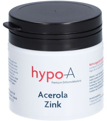Nahrungsergänzungsmittel sind kein Ersatz für eine ausgewogene und abwechslungsreiche Ernährung und eine gesunde Lebensweise.hypo-A Acerola Zink KapselnAcerola Zink verbindet natürliches Vitamin C der Acerolakirsche plus wertvolles Zink. Damit bietet Acerola Zink gleich zwei Spitzenreiter in einem Team: Acerolakirsche als Vitaminwunder und reich an natürlichen Polyphenolen kombiniert mit Zink als zweithäufigstes Spurenelement in unserm Körper.Zutaten: Acerolapulver 68,8 %, Hydroxypropylmethylcellulose, Zinkgluconat 12,5 %Nährwerte: Durchschnittliche Nährwertepro Kapsel% des empfohlenen Tagesbedarfspro 100 gBrennwert6,2 kJ/ 1,5 kcal-868,8 kJ/ 234,4 kcalFett<0,1 mg-<0,1 gKohlenhydrate369 mg-57,7 gEiweiß<0,1 mg-<0,1 gSalz<0 mg-<0 mgVitamin C110 mg137,517187,5 mgZink10 mg1001562,5 mgVerzehrempfehlung: 1 Kapsel täglich mit etwas Flüssigkeit einnehmen.Hinweise: Flüssigkeit einnehmen. Die angegebene empfohlene tägliche Verzehrmenge darf nicht überschritten werden.Aufbewahrung:Kühl und trocken lagern! Stets Außerhalb der Reichweite von kleinen Kindern aufbewahren.Nettofüllmenge:100 Kapsel à 640 mg = 64 gHerstellerdaten: hypo-A GmbHKücknitzer Hauptstr. 5323569 Lübeck ...
