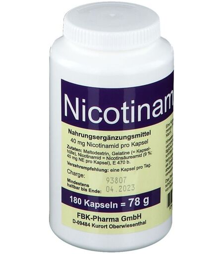 Nahrungsergänzungsmittel sind kein Ersatz für eine ausgewogene und abwechslungsreiche Ernährung und eine gesunde Lebensweise. Nahrungsergänzungsmittel mit 40 mg Vitamin Nicotinamid pro KapselZutaten:Maltodextrin, Gelatine (=Kapselhülle), Nicotinamid = Nicotinsäureamid (9 %; 40 mg NE pro Kapsel) Zusammensetzung: pro Kapsel Niacin 250 % ET* Nicotinamid 40 mg *ET = empfohlene TagesmengeVerzehrempfehlung: Eine Kapsel täglich mit Flüssigkeit verzehren.Hinweis:Außerhalb der Reichweite von kleinen Kindern lagern.Nettofüllmengen (mehrere Größen erhältlich): 90 Kapseln = 39 g180 Kapseln = 78 gHersteller: Vaniplan-Pharma GmbHA1030 Wien ...