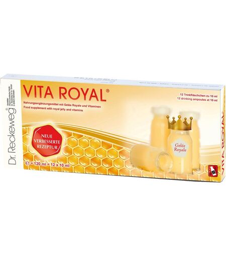 Nahrungsergänzungsmittel sind kein Ersatz für eine ausgewogene und abwechslungsreiche Ernährung und eine gesunde Lebensweise. Vita Royal® Trinkampullen Unterschätzen Sie nicht die Warnsignale des Körpers, denn ständiger Leistungsdruck kann die Balance beeinträchtigen. Eine ausreichende Vitamin- und Energiezufuhr bildet dabei eine wichtige Basis für die Gesundheit. Zutaten:Wasser, Zucker, Gelée Royale, Vitamin C, Niacin, Antioxidationsmittel: E306,Pantothensäure, Vitamin B2, Vitamin B1, Vitamin B6, Biotin, Folsäure, Farbstoff:Beta-Carotin, natürliche Aromen. Nährwertangaben: je 10 ml % der Referenzmenge* Gelée Royale lyophilisiert 90 mg Vitamin C 100 mg 125 % Niacin 20 mg NE 125 % Pantothensäure 4,0 mg 67 % Vitamin B1 2,0 mg 182 % Vitamin B2 2,0 mg 143 % Biotin 300 µg 600 % Flosäure 200 µg 100 % *Nährstoffbezugswerte / nutrient reference values (NRV) gemäß EU-Lebensmittelinformationsverordnung. Verzehrempfehlung: 1 Trinkfläschchen pro Tag. Kann auch mit Wasser verdünnt werden. Warnhinweis: Die angegebene empfohlene tägliche Verzehrsmenge darf nicht überschritten werden. Hinweis: Gelée Royale kann, wie andere Bienenprodukte, in seltenen Fällen allergische Reaktionen auslösen. Bei bestehenden Überempfindlichkeiten sollte Vita Royal® nicht getrunken werden. VorGebrauch kräftig schütteln. Enthält Zucker.Aufbewahrung: Kühl und trocken lagern. Außerhalb der Reichweite von kleinen Kindern aufbewahren. Nettofüllmenge: 12 Trinkfläschchen zu 10 ml = 120 ml. Herstellerdaten: Dr. Reckeweg GmbH Berliner Ring 22 64625 Bensheim ...