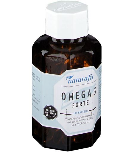 Nahrungsergänzungsmittel sind kein Ersatz für eine ausgewogene und abwechslungsreiche Ernährung und eine gesunde Lebensweise.naturafit® Omega-3 forteHochdosiertes marines Omega-3-Konzentrat mit 75 % hochungesättigten natürlichen Omega-3-Fettsäuren (42 % EPA, 21 % DHA). Sie tragen zu einer Senkung des Blutdrucks und zu einer Hemmung der Verklumpungsneigung der Blutplättchen bei. Ferner tragen sie zu einer Verminderung der Fibrinogenbildung bei, wodurch sich die Fließeigenschaften des Blutes und dadurch die Sauerstoffversorgung von Organen und Geweben mit kleinen Blutgefäßen verbessert.Zusammensetzung:Omega-3-Konzentrat (enthält Eicosapentaensäure = EPA und Docosahexaensäure = DHA), Gelatine (Rind), Glycerin, Wasser, Tocopherol Frei von Lactose Frei von Gluten Frei von Farbstoffen Ohne Zusatz von KonservierungsstoffenNährwerte: Durchschnittliche Nährwerte pro Kapsel (Tagesempfehlung) hochdosiertes Omega-3-Konzentrat 500 mg Verzehrempfehlung:Täglich 1-2 Kapseln zur ergänzenden VersorgungHinweis:Die angegebene empfohlene Tagesmenge darf nicht überschritten werden.Aufbewahrung: Kühl (6-25 °C) und lichtgeschützt lagern. Außerhalb der Reichweite von kleinen Kindern aufbewahren.Nettofüllmenge:180 Kapseln = 122,6 gHersteller:Naturafit GmbHAm Sandfeld 9 + 1191341 Röttenbach ...